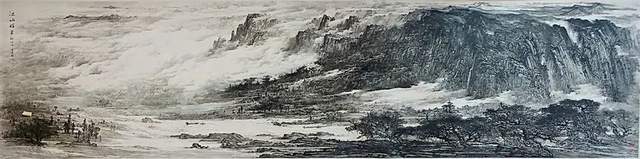万物以气为生,势立则物立。胡江的画,以云雾造势,以虚写实,上灵下实,阴阳一统。胡江的诸多画作,令人不能不联想到一幅幅行草巨制。十多米长卷,群山莽莽,山间云蒸霞蔚,云彩翻滚林海,其势滔滔。这些画,几乎全用传统水墨。黑白之间,或者说并不着墨之“白”处,气韵如流,群山起伏蜿蜒其间,如龙在舞,恢弘之势弥漫整个画面,唤起观赏者无尽神思。