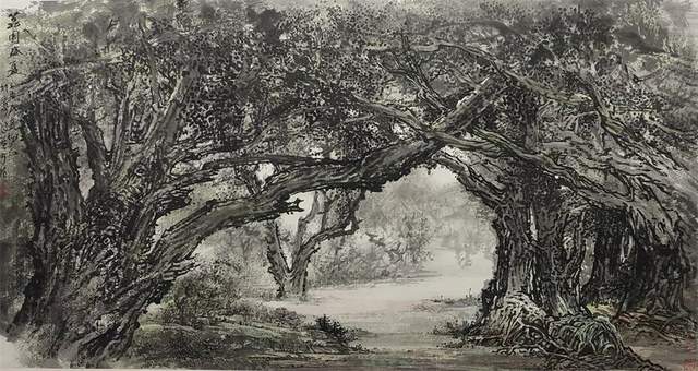 ……在胡江老师的画中,高山极天,树木深郁,以墨写之。画面留出虚白,如行云流水,变化莫测,以不同的形态出现在画面里,飘浮在大山的山头、腰间,萦绕于清晨的水面、林中,或是在村庄的田舍升起,谓之天,谓之云,谓之烟,谓之水,谓之万象。在画中,其迷蒙氤氲而又壮阔悠远,与茫茫黑墨互为吞吐。一轻灵一刚劲,相得益彰。留白的地方成了画眼,使画面在浓郁厚密透出灵气。通幅构图的大片空白是颇费经营的部分,而实处的小空白,更难安排。在山水树石间,留下斑斑点点空白。这些空白,大大小小,时聚时散,使画面气韵贯通,浑然一体。黄宾虹曾云:作画如下棋,要善于作活眼,活眼多,棋即取胜。所谓活眼,即画中之虚也。我们不得不说,胡江老师是个下画棋的高手。