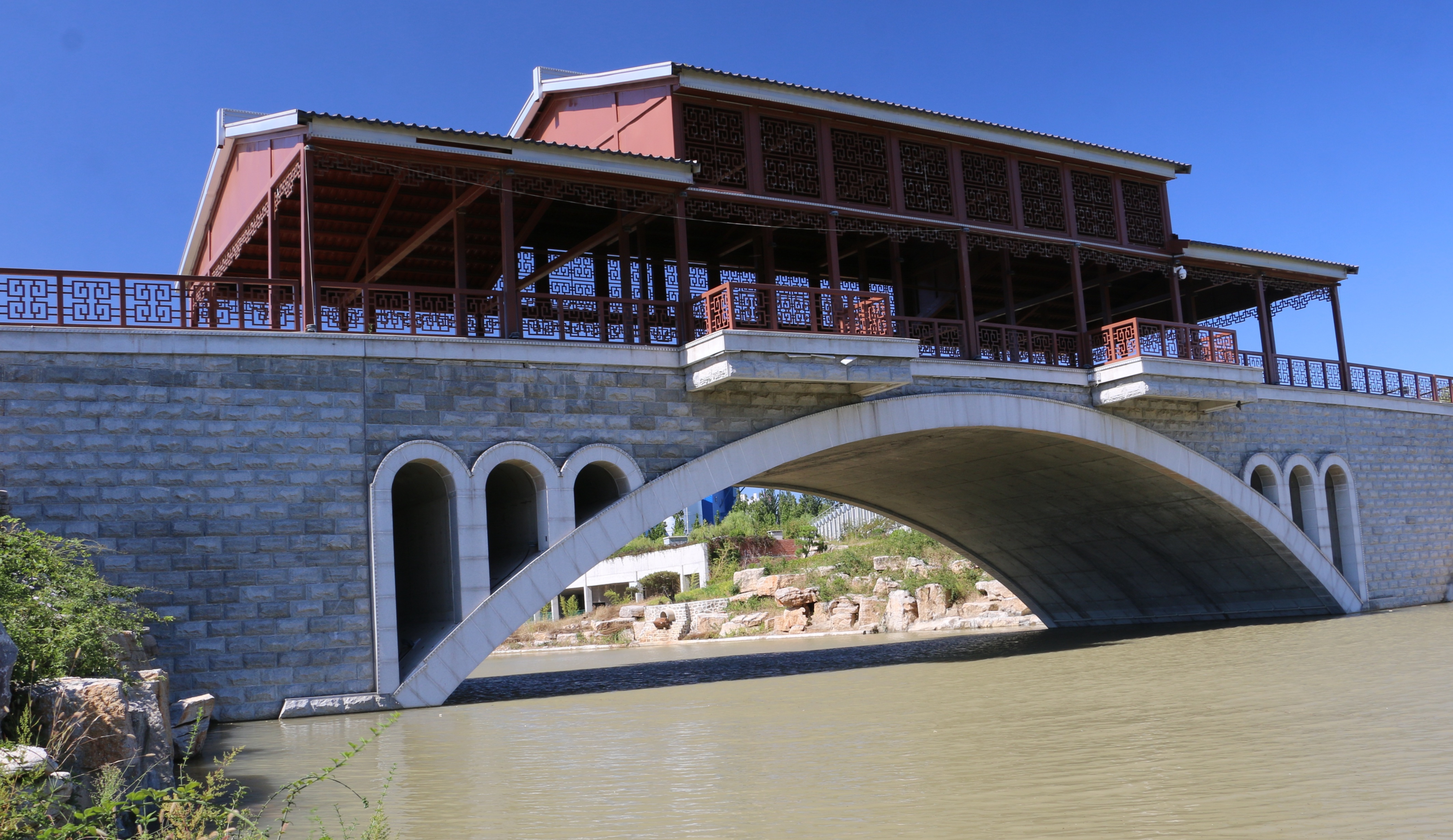 沿着双向沥青路出村东行二里多,来到了东范阳河。昔时干涸的河床现是一碧南北的清流。两岸是郁郁青青的草树植被。令我们震撼的是脚下这座横贯西东连两村的宏伟大桥,宽阔的双向沥青路面,紫红色的桥栏,古色古香的遮避凉亭,一拱六洞,外饰青砖白缝,优雅壮观。毕书记介绍说:“建设新村所有项目的投资都是贾木海董事长创建的山东宝山科技有限公司捐赠,是新村治理发展的动力源泉。整治范阳河工程包括疏浚河道,加高加固绿化岸堤,筑十道蓄水拦河坝和两座翻板闸,建桥铺路修亭栏,耗时两年多,斥资九千多万。”毕书记说,这河基本上解决了数百亩农田灌溉,这桥圆了两村人的千年“桥梦”,人们都亲切地叫它“连心桥”。“感时花溅泪”,看着河,走着桥,我们这些花甲古稀老人感慨万千。往事涌心,我不由热泪盈眶......