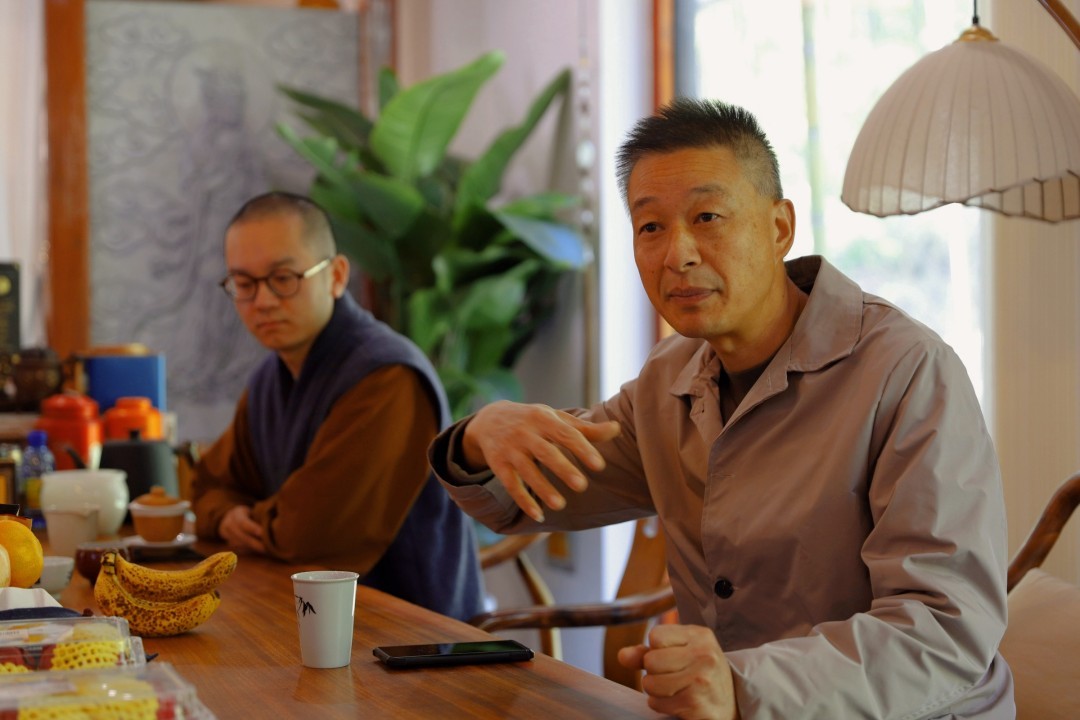 图:安吉县佛教协会秘书长程能杰(右)发言