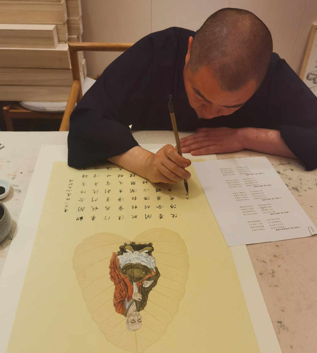 图:湖州市佛教协会会长慈满法师在为叶画题词