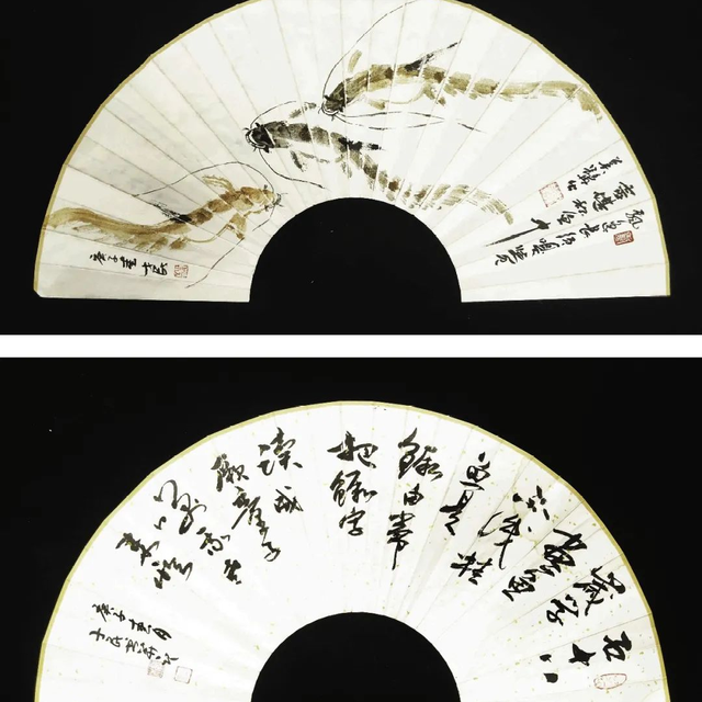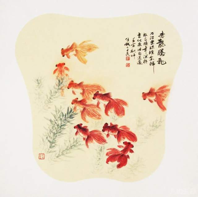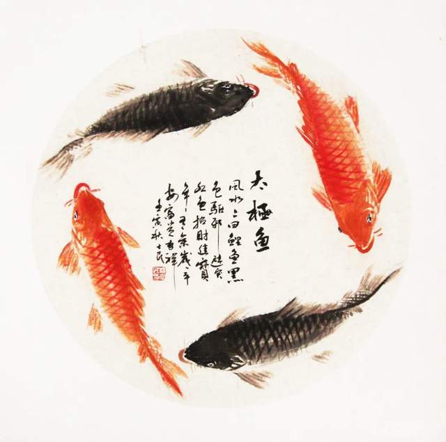 杨士民画鱼,用笔用色及画的意境均有独到之处。他用的是中国画的传统笔墨线条和渲染手法,但在画意制造上却毫不泥古,构图上呈现出几何化、平面化的现代构成趋向。他画中鱼的造型往往形成书法一样的抽象意味,以线条的扭动、交织和穿插,组合出特殊的韵味。他喜欢用鲜亮的颜色与浓淡墨色相互烘托,因此画面效果便显得新潮而时尚,颇多现代气息。就连他的落款,虽无附庸风雅之古意,却多了几多清新的时代感。