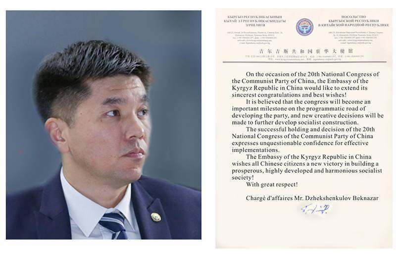 吉尔吉斯斯坦驻华大使馆代理大使别克纳扎尔•杰克申库洛夫先生祝辞:在中国全国代表大会召开之际, 吉尔吉斯斯坦共和国驻华使馆以最诚挚的祝贺和良好的祝愿!