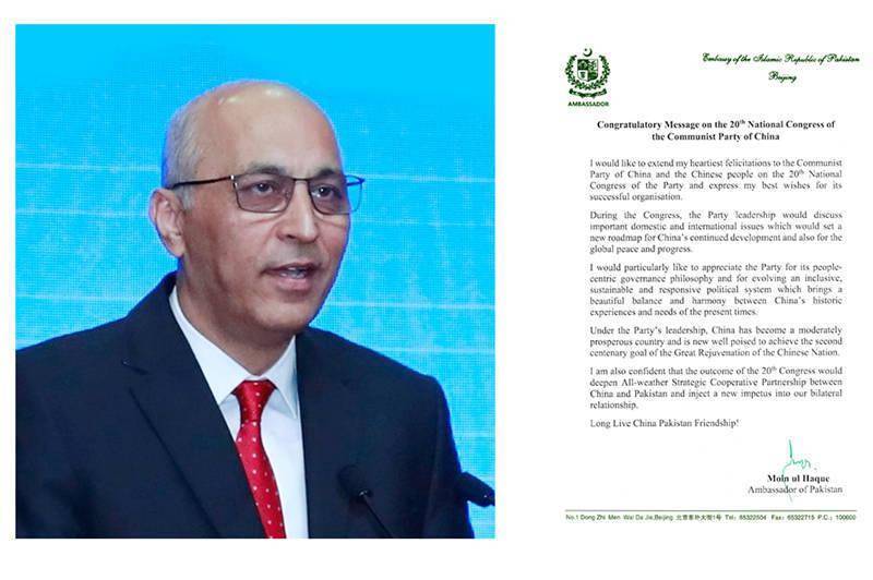巴基斯坦驻华大使莫因•哈克阁下的贺词。他表示, 在此, 我谨就中国的盛会向中国共产党和中国人民表示诚挚的祝贺!在大会期间, 党的领导层将讨论重要的国内和国际问题, 为中国的持续发展和世界的和平与进步制定新的路线图。
