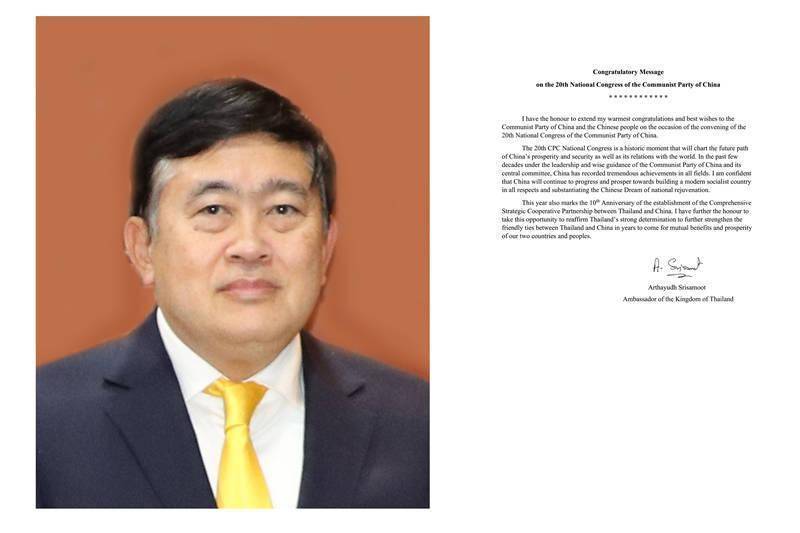 泰王国驻华大使阿今年也是泰中建立全面战略合作伙伴关系10周年。我有幸借此机会重申泰国坚定决心在未来几年进一步加强泰中友好关系, 以实现两国和两国人民的互利共赢。
