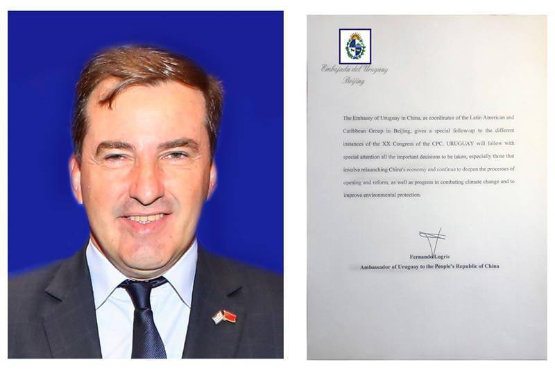 乌拉圭驻华大使费尔南多•卢格里斯阁下祝辞:乌拉圭驻华大使馆作为拉丁美洲和加勒比集团在北京的协调人, 对中国大会进行特别的跟进, 乌拉圭将特别关注大会即将做出的所有新的重要决定, 特别是那些涉及重振中国经济、继续深化开放和改革进程、以及在应对气候变化和改善环境保护方面取得进展的决定。