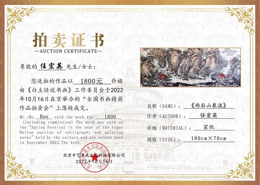 由中国文化艺术人才库组织的“全国书画精英作品拍卖会第33期”于10月16日在京举行。画家任宏英的画作《雨后山泉流》在多轮激烈的竞拍中以1800元被藏友收藏。