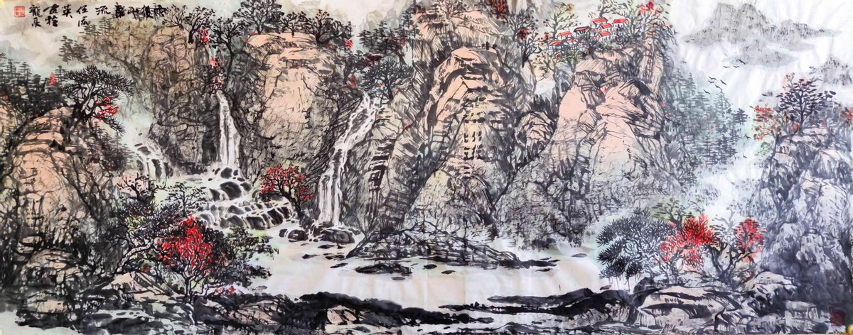 作品概述:此画画的是雨后初晴的景象:空气清新,山泉汇集,水流增大。右侧中远景,水汽淋漓,为北地风光增添一抹南方韵致——这样的太行美景颇为动人。画中山代表的是靠山,山上有瀑布一泻而下(也就是水有源头,水在五行中代表财),从石缝中等各个方向涌来,代表八方来财。画的右上角是中间的山与后面的山在白云的映衬下,形成一个元宝形。