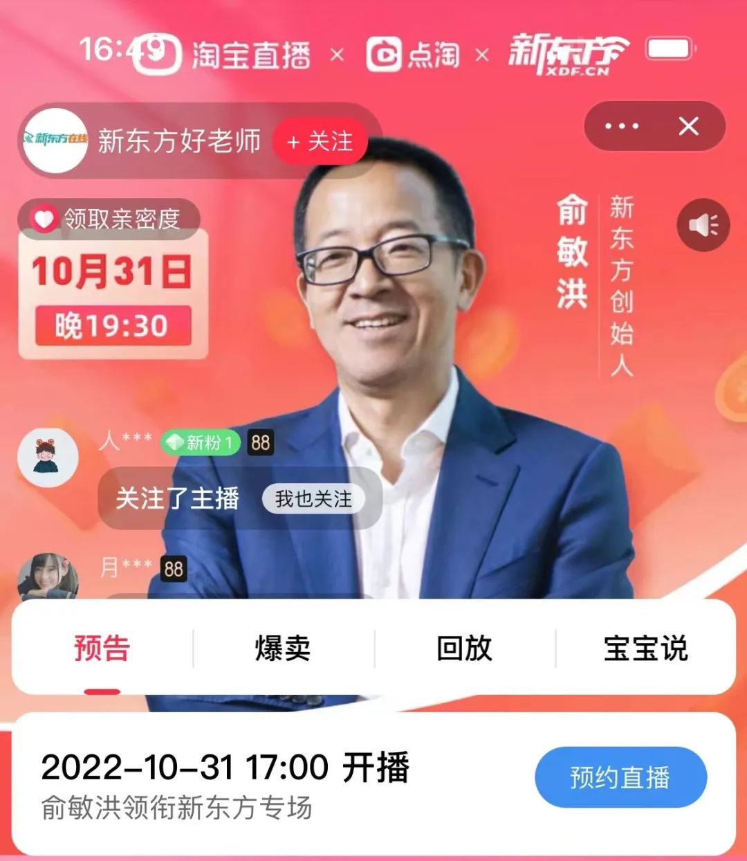 与罗永浩以及“交个朋友”一同入淘的还有俞敏洪,淘宝直播方面透露称,俞敏洪将于10月31日晚现身“新东方迅程教育专营店”淘宝直播间。