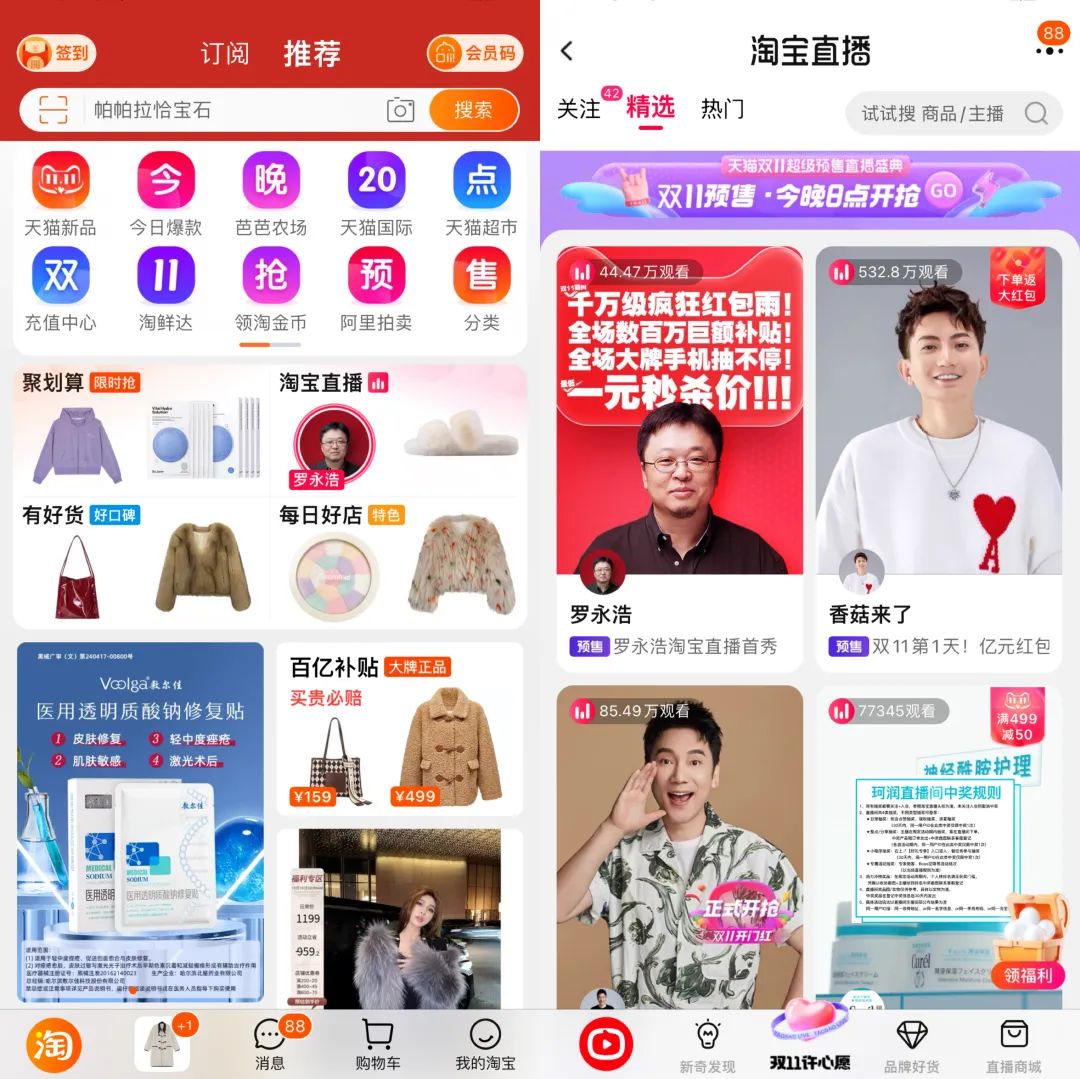 淘宝也对这场直播倾注了一定的资源,据亿邦动力的消息,淘宝会在罗永浩首播当天给予5000万UV的支持。在10月24日直播当天,不管是淘宝首页还是淘宝直播的精选页面,都能看到罗永浩直播的提示。
