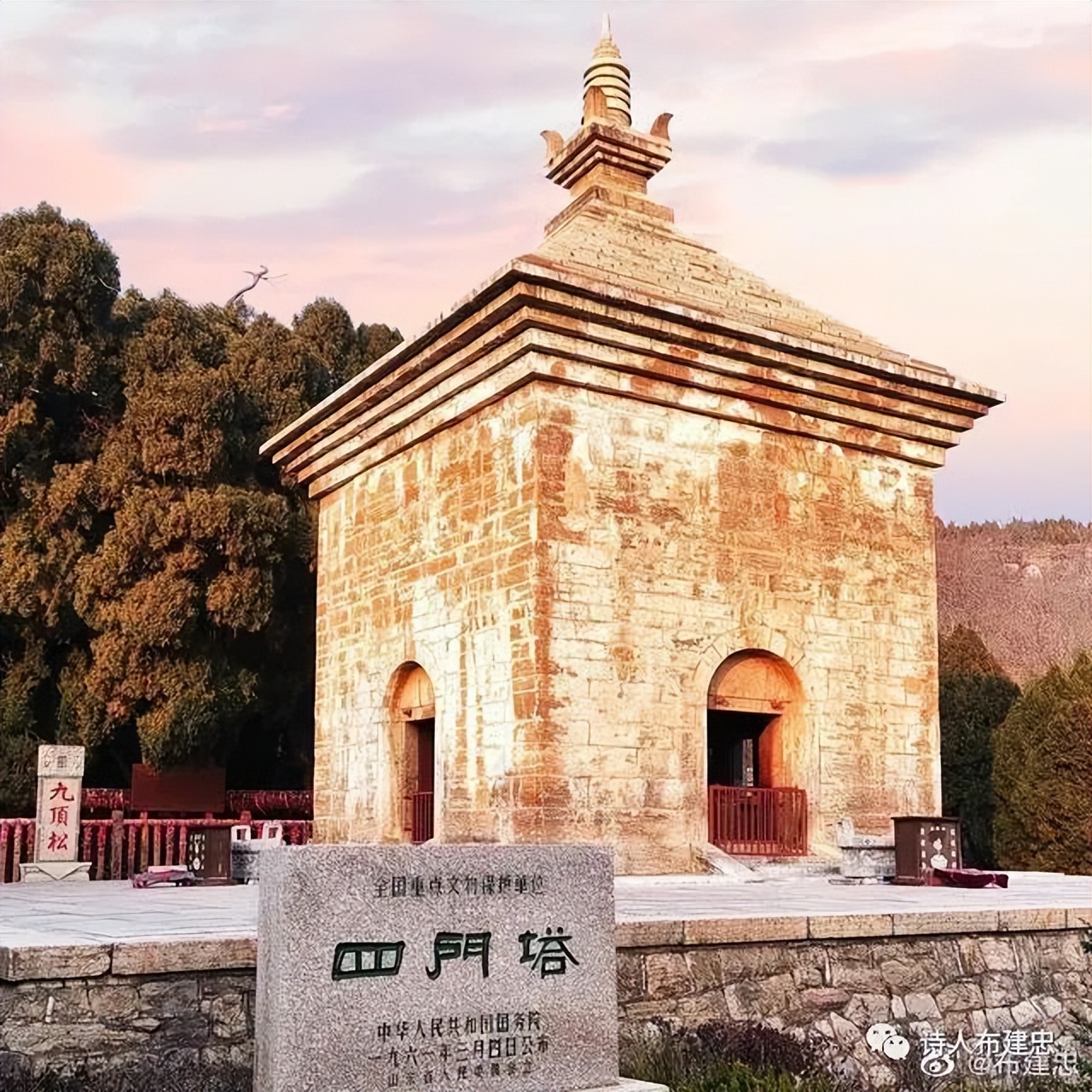 注1:在济南南部山区四门塔北侧,有古柏一株,生有九大主枝,人称“九顶松”。清《泰山道里记》曰“塔前古柏一株,九顶苍秀,传云汉植”。此树髙约15米,树围5.4米,虽树龄两千年,仍挺拔苍劲,茂密葱茏,与四门塔交相辉映,今人合称“古塔松风”。此树汉代所植,已有两千多岁,相传凤凰衔枝而生九顶,因当地人“柏”读“bei”音,古人忌“悲”,故名九顶松。此树历经沧桑,受寺院经声佛号熏陶已心中有佛,善男信女每每求佛都如愿以偿。据记载隋文帝杨坚曾在此树下求愿,后果登大基。随于开皇三年(公元583年)改郎公寺为神通寺,封此树为神松。凡求愿者须绕树正三圈反三圈并系以求愿灵符,即可保你心想事成,鹤寿遐龄。