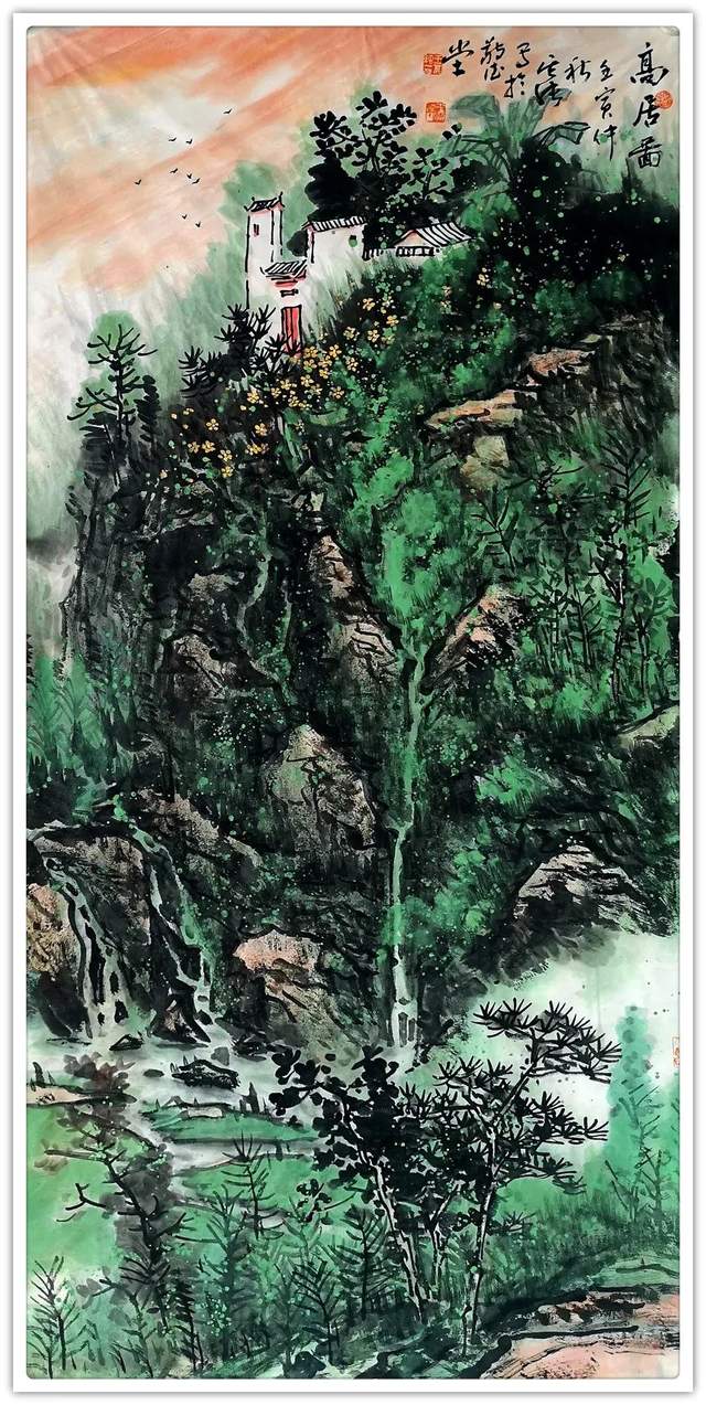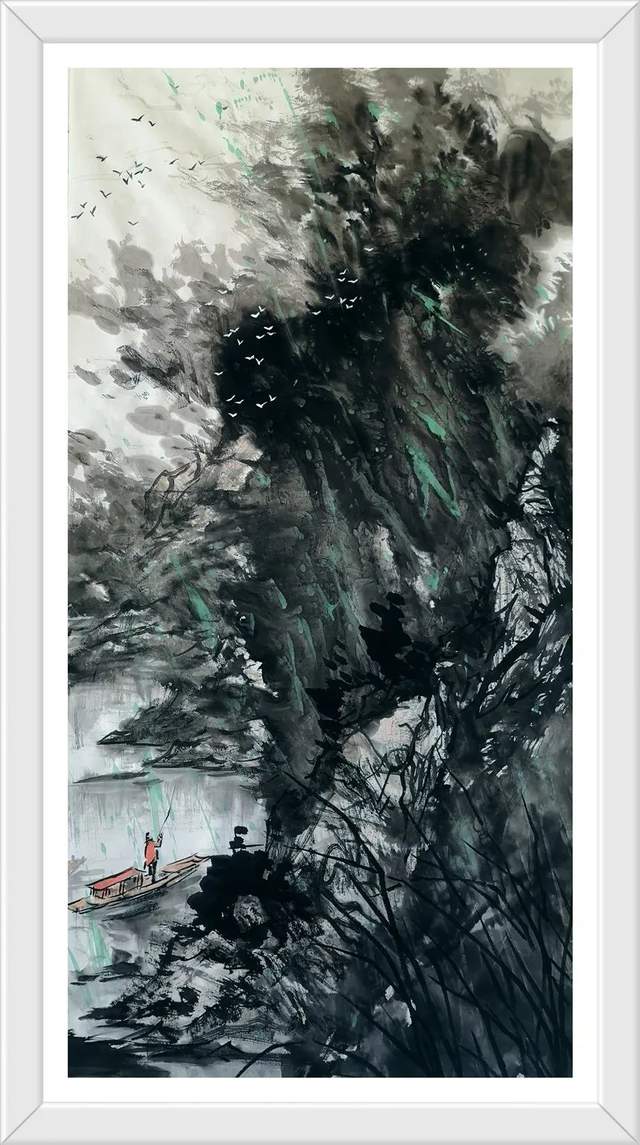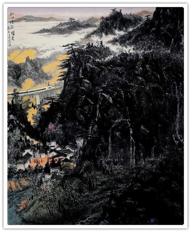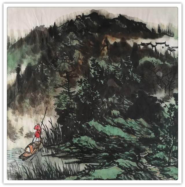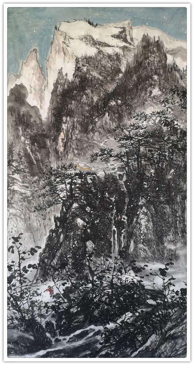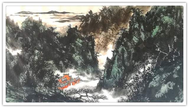 他的山水精通于青绿雅视,也精通于水墨显韵,法源多门,显然不是居于小室闭门造车的封闭,而是让笔墨打破了门户阻隔,对丹青各派进行了极有远见的融汇贯通!用笔坚劲与拂柔并存,是北宗南派的有机融合,大小斧劈皴法擦勒奇俊壮观,卷云雨点皴法表达秀意格调,披麻顾应牛毛,转承自如,可谓是笔法娴熟,皴意万变,如果没有对历代名家名作心追手摩的磨砺,绝不会在笔法的运用上达到如此丰满的境界,一幅山水总是在笔法的纵横下,成为风骨奇峭的仰目奇观,有劲逸有气度,信念游云闲适自由!