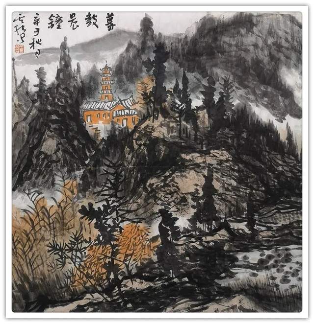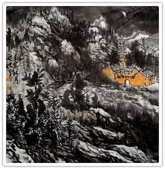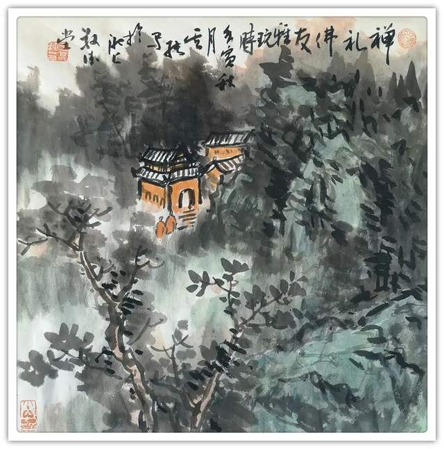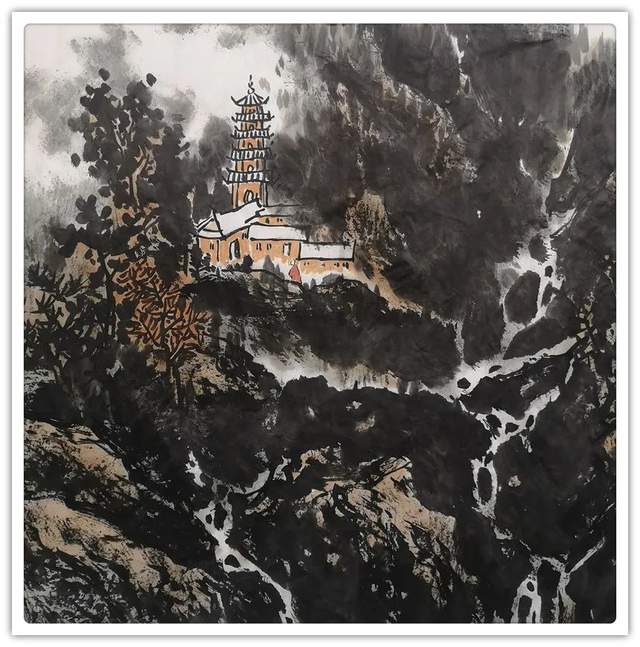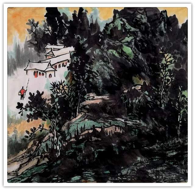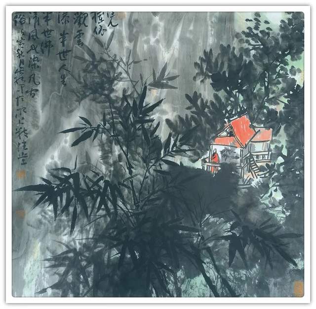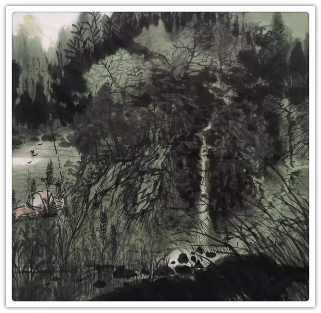 他的山水精通于青绿雅视,也精通于水墨显韵,法源多门,显然不是居于小室闭门造车的封闭,而是让笔墨打破了门户阻隔,对丹青各派进行了极有远见的融汇贯通!用笔坚劲与拂柔并存,是北宗南派的有机融合,大小斧劈皴法擦勒奇俊壮观,卷云雨点皴法表达秀意格调,披麻顾应牛毛,转承自如,可谓是笔法娴熟,皴意万变,如果没有对历代名家名作心追手摩的磨砺,绝不会在笔法的运用上达到如此丰满的境界,一幅山水总是在笔法的纵横下,成为风骨奇峭的仰目奇观,有劲逸有气度,信念游云闲适自由!