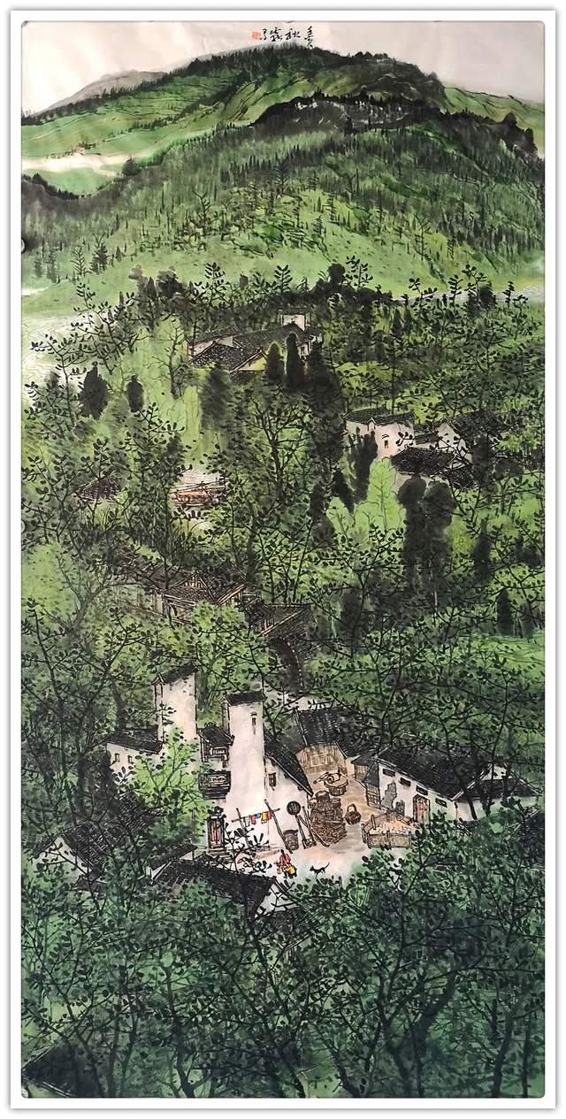 他历来的艺术主张:从意境出发,强调笔墨服从意境,笔墨和意境相统一。作品画面,境界辽阔,笔墨华滋,远山烟云掩映,苍茫滋秀,起伏连绵,树木葱茏,朴实自然,既有北方山水的雄浑高亢、阳刚劲拔之气,又有南方山水的婉约秀丽、清新芬芳的独特意境。作品善于从大处入笔,从细处经营,重笔墨,讲气韵。其笔墨语言,取法范宽、黄公望、石涛、王蒙、黄宾虹等人精髓,画面层层累积,反复运用皴擦、渲染、点染等技法,使线条之间不断重叠交错,变化丰富,纷乱而又精密,色彩平和雅致,水墨渴度适宜,产生一种自然神韵淋漓、画面平淡天真、意境深邃幽远的艺术效果,从而达到峰脉活络,息息相生,透着湿润和生机,直追生命本质。线条,或柔韧、或粗犷、或唯美,显露出画家对生活的深沉爱意,对艺术的闪光追求。在他的作品中,生和息、动和静、晨与晚、春和秋等,都是一种生命运动形式。表现技法,既有传统山水的深厚,又融入了现代意识与时代审美情趣,使新与旧、雅与俗、传统与现代等都达到完美的结合,形成了质朴欢快、苍翠清新的新徽派山水风格。