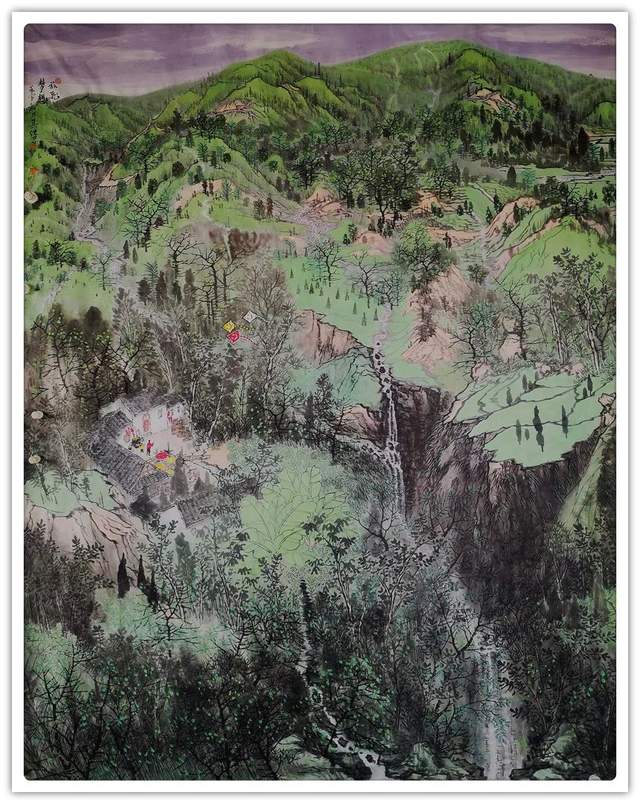 师法前贤是为根基,师法造诣是为创作。他的山水在师法古韵的道路上走得很深刻,所以极有清代四王山水的书卷气与雅致格。但是,他的山水画又避开了清代四王山水稍有腐旧的呆板,这就是他的技法虽然师承先贤,但在与山水对话的过程中又有自己独立的创建。山水画不是粉本临成的,而是真山真山写成的,是自我身心供养于云蒸霞蔚中形成的个性艺术感悟。走遍千山万水,用心驱动墨彩,像黄公望写意富春山一般卓绝。没有人能再画出富春山居图,也没有人再能重复王其纯的山水风,这是因为他们的经历是“自己的”,是独与天地精神往来的成就!用墨是心音,设彩为情绪,淋漓透彻,有积墨成明黑的苍茫质感,也有破墨氤氲的多彩动感,铺陈妍雅,气韵高华,斗绿争青,绮罗透韵。彩与墨的流动,让山水尽得质感之上韵律风情,好山好水好境界!