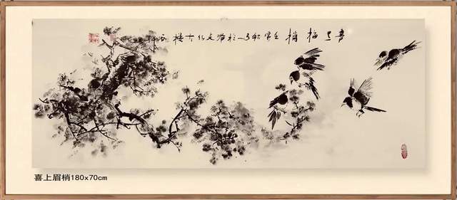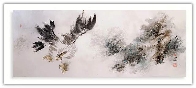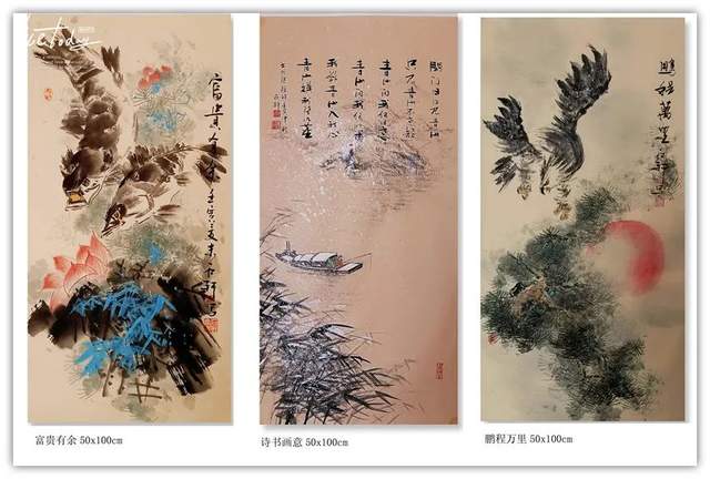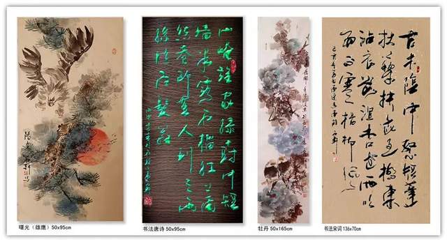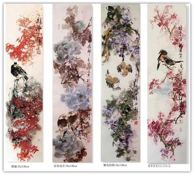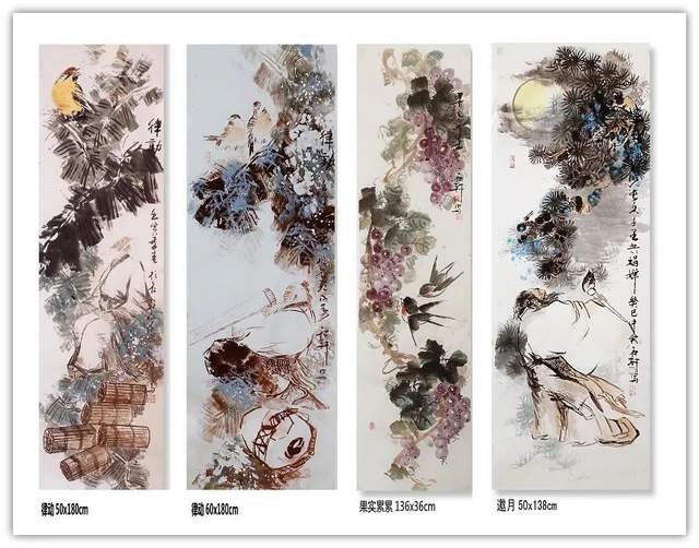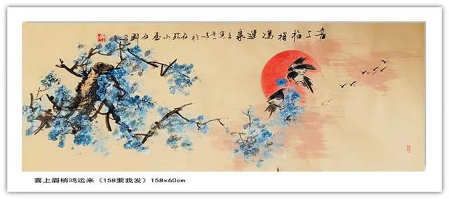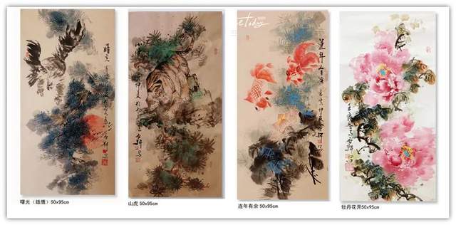 他创作的《果实累累》、《花开富贵》、《暗香浮动》等国画作品,色彩斑斓,布局饱满,给人以清新自然、古朴广博、新颖灵动的感觉。观郭石轩老师的国画作品,不但画的题材宽广,花鸟,动物,山水草木等均有涉猎,并下笔如有神助;而且其画风纯正,心随笔运,神思迭出,不落窠臼,毫无刻板、呆滞之感,整体画面给人干净利落的视觉享受。更进一步说,从画理上,他也摆脱了形的纠缠,已达到形而上的境界。因之,他的画作中,屡见巧拙相参,拙而能巧,时出奇趣,峰回路转之佳品。如《大吉图》、《富贵吉祥》、《锦上添花》、《鹰击长空》、《寿比南山》、《风光不与四季同》等作品,构思奇绝,灵气十足,神韵俱备,令人观之无不心旷神怡。在简练的笔墨、造型、设色中,将一个个动物的神态,一枝枝花草的神韵表现得淋漓尽致,足使雅俗共赏,先睹为快。“画到精神飘没处,已无真相有真魂”,历代书画前贤的艺术理念在郭石轩老师的头脑中已深深扎根,必然使得他洒脱老道的画笔下将呈现出更多更美的优秀作品。
