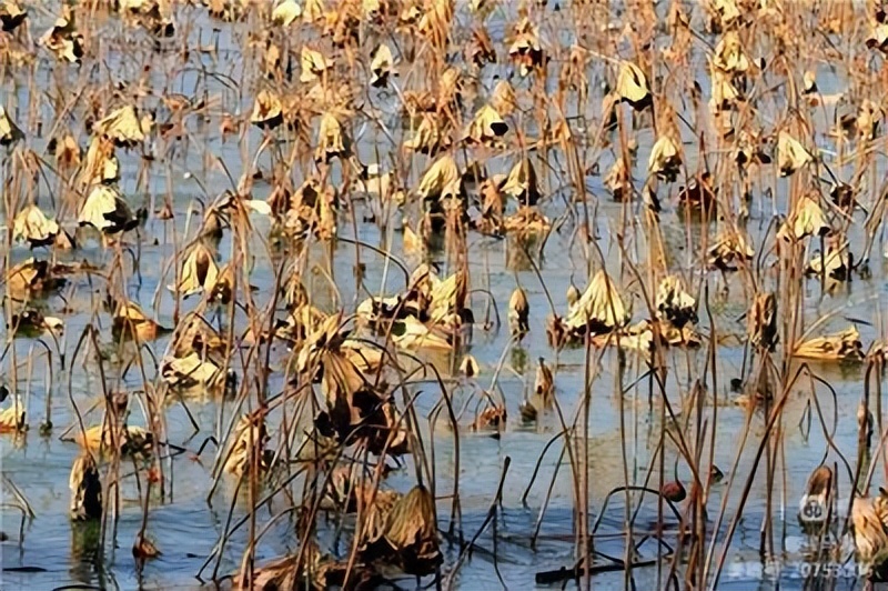 荷花凋谢残枝立,虫已蛰伏入洞藏。