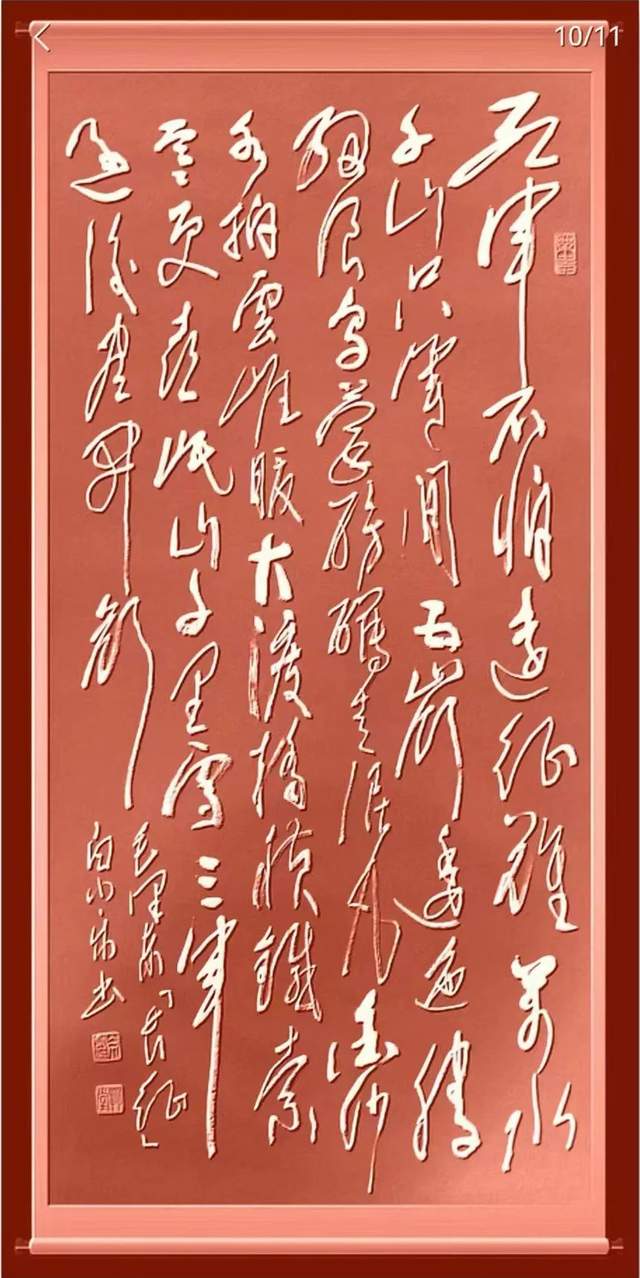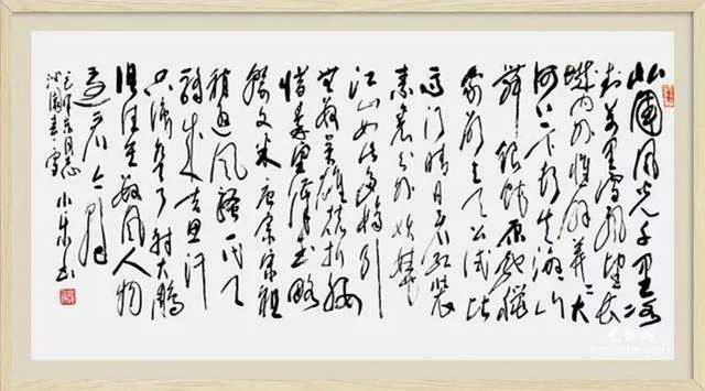 白小乐信奉王羲之的观点,凡作书法,定意在笔前,字居心后,未做之初,已成竹在胸,故随手所如,皆入法则。白小乐草书行与行、字与字紧凑茂密、开张纵横自然。点画寓使转之中,性情发形质之内。提处细若丝发、圆润遒劲,按处中锋直下、沉着不滞。笔法轻重使转自如,极富变化,结体疏密错落有致,字法万态。因势生形,行间丝带连绵,往复回旋,收放节奏和谐,字里行间浑然一体。整幅作品,奥妙绝伦不可形容,纵横变化发于毫端,熟而不俗,险而不怪,深得草书”三昧”。