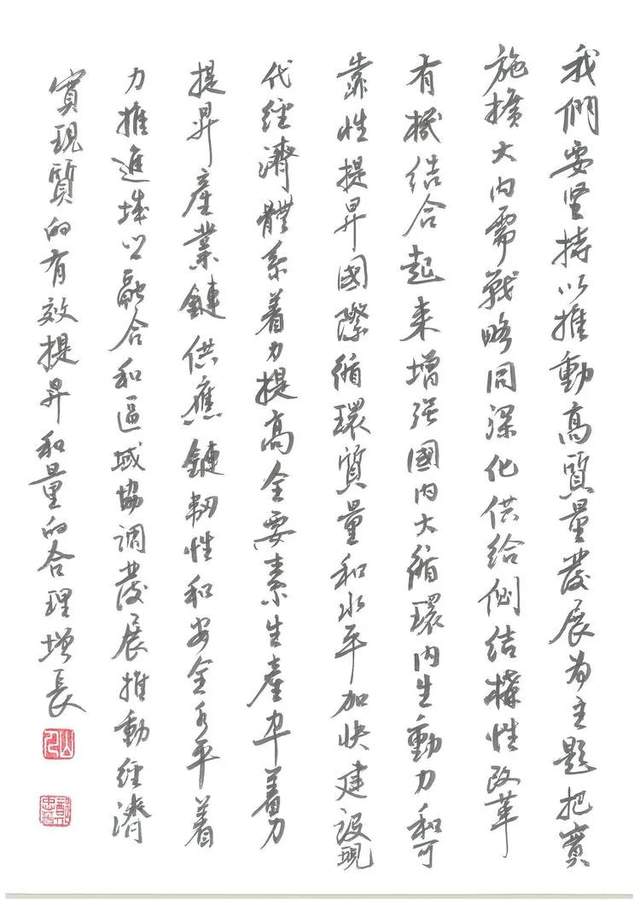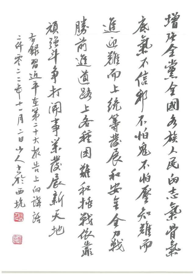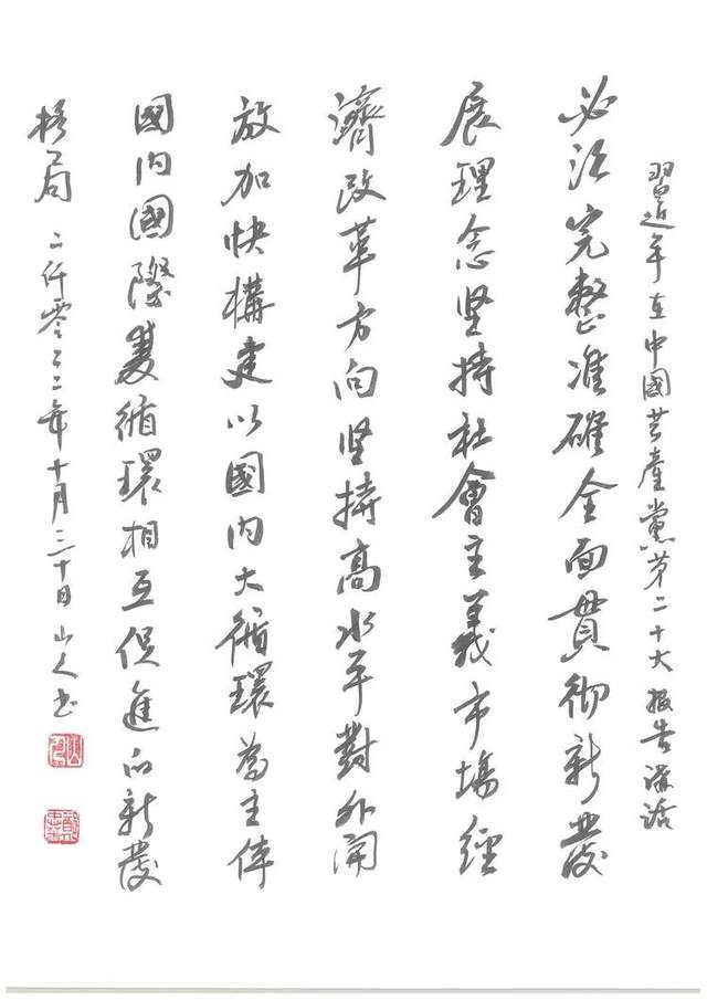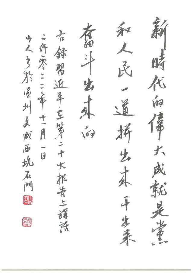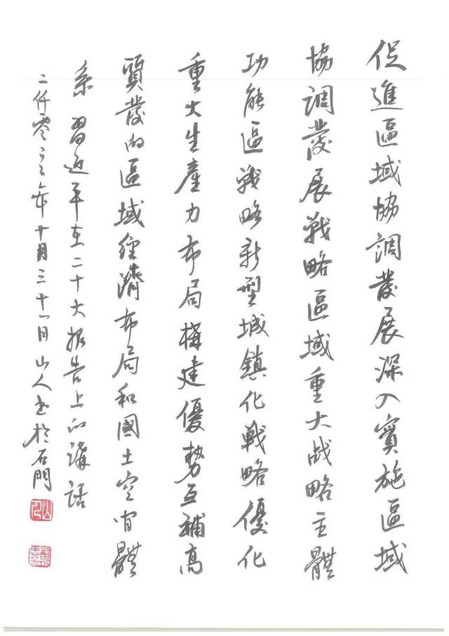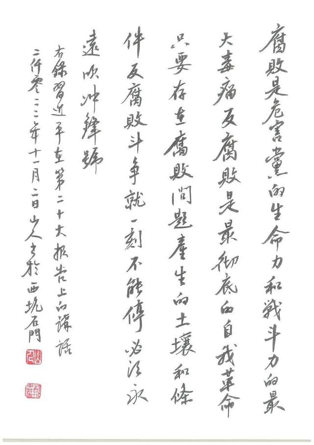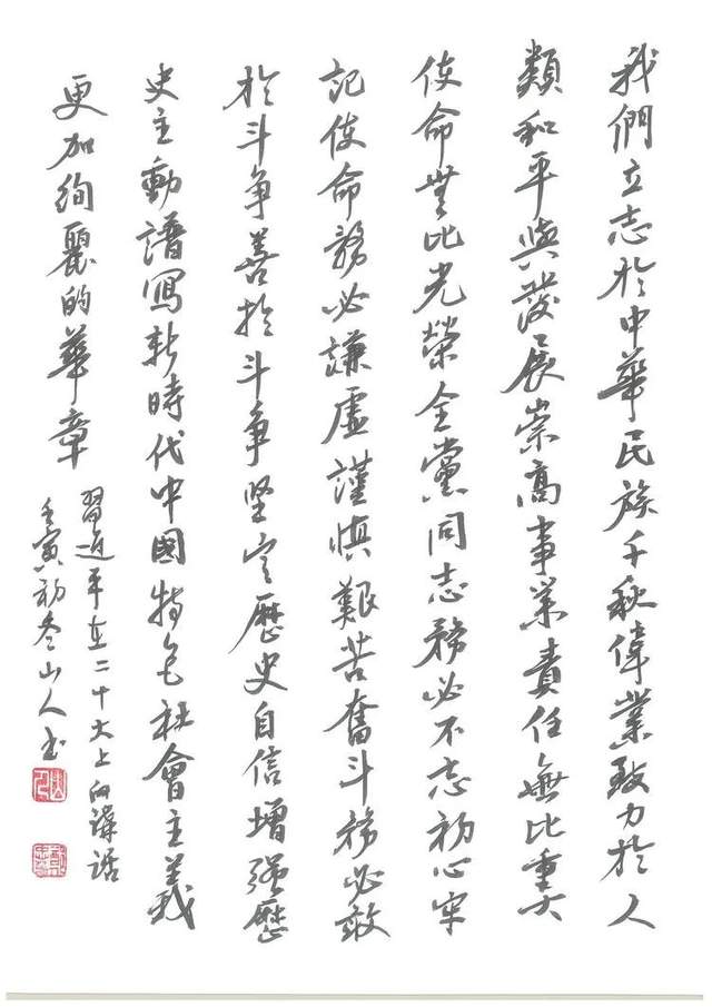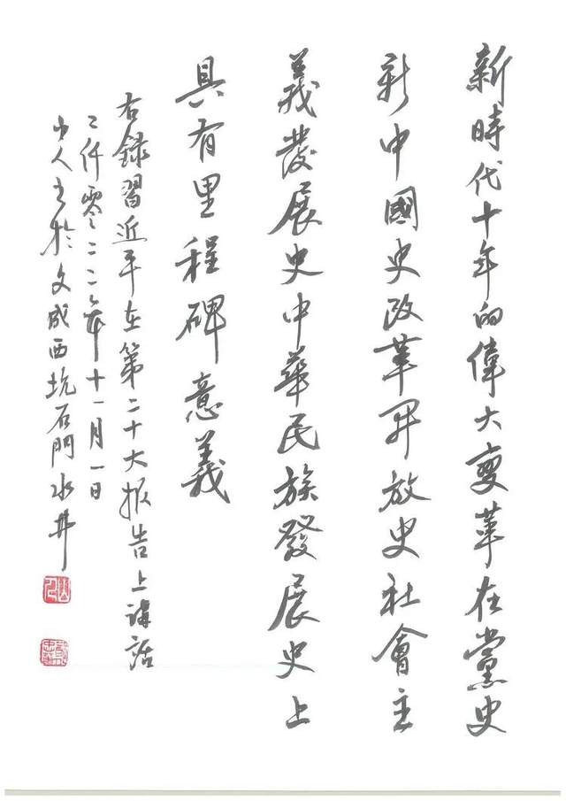 抑左扬右,高低有趣。郑忠华写书法,有心修于此,意泊于此的追求,可以拒绝一切烟火气,醉得笔墨写古风儒雅。却不拘泥,又善于写录政经文章,书以载道,刚柔相济。笔墨亦可以写铿锵,书言志,歌盛世!技与艺谐,名与功成!