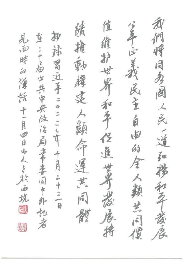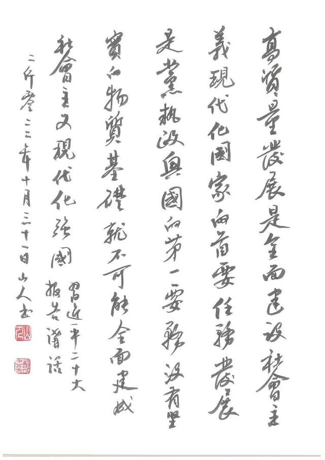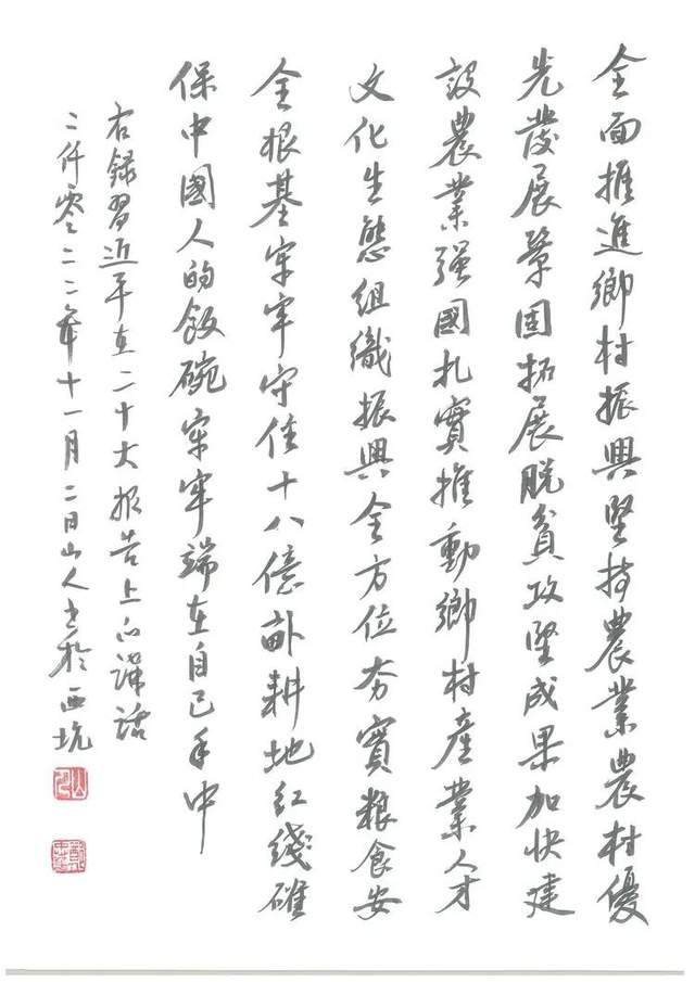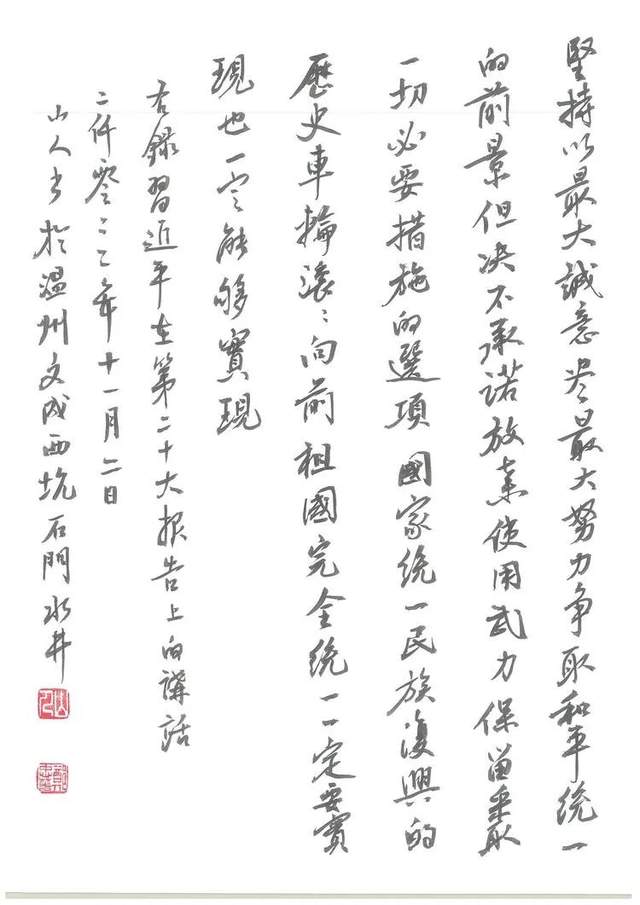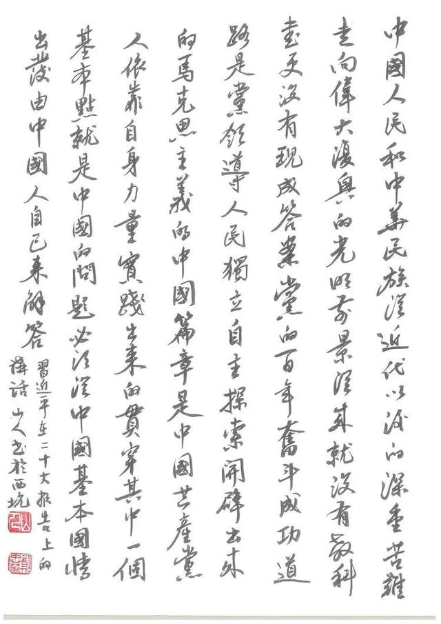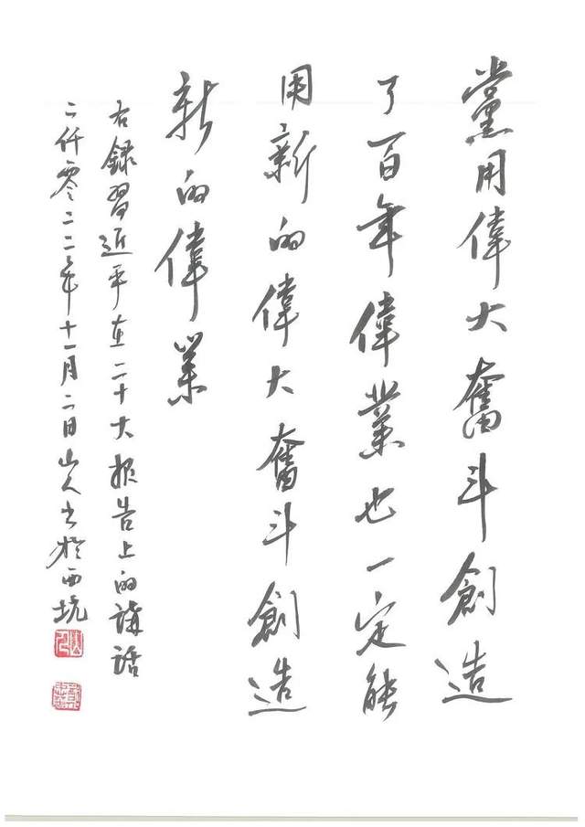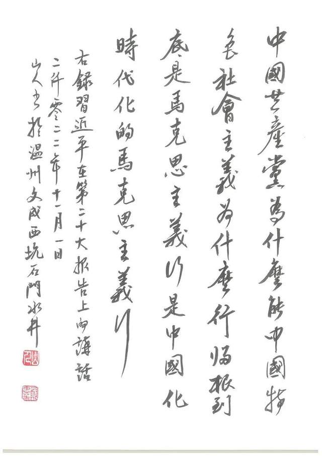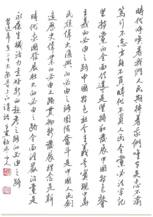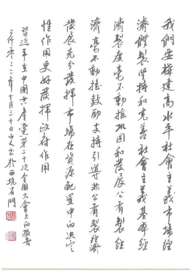 抑左扬右,高低有趣。郑忠华写书法,有心修于此,意泊于此的追求,可以拒绝一切烟火气,醉得笔墨写古风儒雅。却不拘泥,又善于写录政经文章,书以载道,刚柔相济。笔墨亦可以写铿锵,书言志,歌盛世!技与艺谐,名与功成!