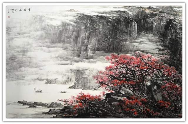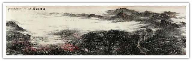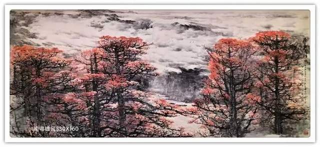 《万古丹霞》高二米、 长十米, 从题材本身到作品尺幅, 就注定 了这幅作品的宏大气象。这幅作品的写实背景是广东韶关的丹霞地貌, 丹霞山及其周边的景观 2004 年就被认定为世界地质公园, 同时也是世界自然遗产。其自然风光的雄奇、秀美令人称奇,其独特的人文景 观更是世界罕见。