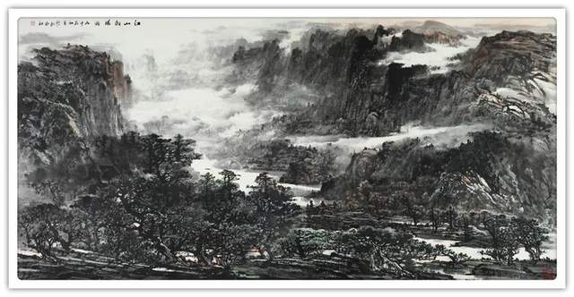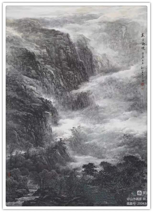 这几点也是胡江作品的典型特质:在气象、 气度、 气韵的有机融 合中, 在客观物象和主观心像的平衡中,在笔墨线条的以我手写我心 的抒发中, 达到审美个性与内在精神的融合。纵观胡江老师多年来的创作,我发现他喜欢画充满生机和生命力 的山水, 他说过他从不画穷山恶水。他的许多作品都是选取了春山春 水为主题。对于美和生命力的追求,难道不是一种最美好的时代精神。时代精神并非一定是宏大的主题才能担当,当我们每一位艺术创 作者都怀着热烈的激情去表现爱、美好、生命力, 当我们欣赏者在作 品中都读到了希望、力量和和谐,这样的作品一定就充满了时代精神。
