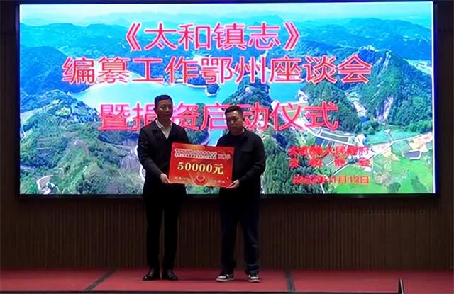 捐资启动仪式上,现场收到鄂州楚商联合会常务副会长柯博学捐资5万元,太和商会会长柯国良,副会长朱欢、夏多枝、吴小涛、陈艳兵,监事长刘友全、秘书长姚志刚每人捐资1万元,作为《太和镇志》编纂工作经费。