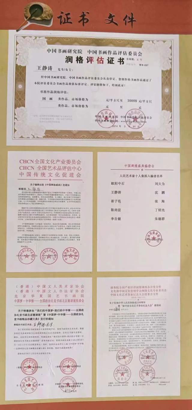 王静涛闭关期间的出炉作品,荣获中国当代实力派书画家润格作品收藏金奖、中国当代实力派书画家奥运国际交流展金奖,其化作被编入《中国梦、中华情——全国政协礼堂书画精品珍藏大典》;王静涛是中华文学艺术界联合会首批会员、中央民族大学特聘国画教授,《 中国辉煌大典》十大人民艺术家之一。