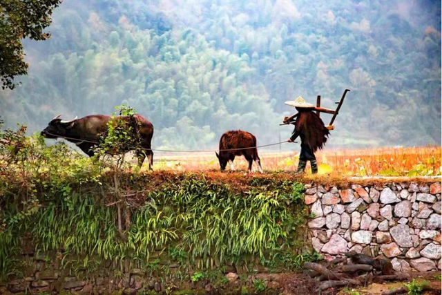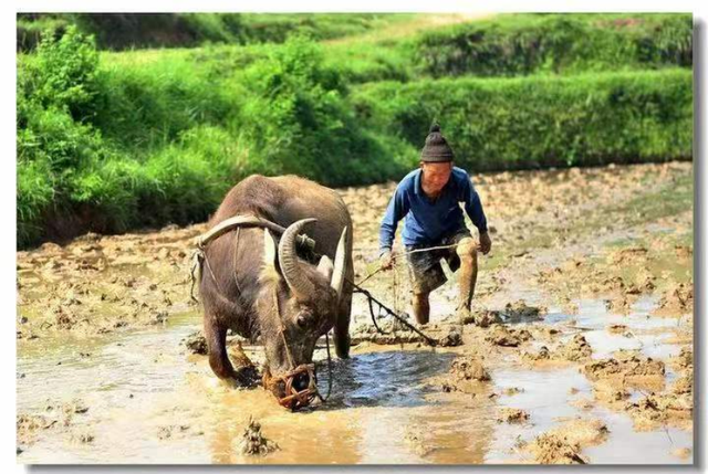 上世纪六十年代,祖父倦相公是生产队里扶犁掌耙的老把式,也是那时乡村农耕这一技术农活的行家里手。布谷声声劝早耕,春锄扑扑趁早晴,在那个时期,每年立春过后,惊蛰将至之时,沉睡了一个冬天,初春的家乡田野,那些长满绿叶红花紫云英(俗称:红花草)的冬水稻田,又鲜活起来:春雷涌动,细雨绵绵,草长莺飞,麻鞭水响。每当吃过早饭,生产队出工的哨声响过,祖父倦相公便披上用棕片编织的蓑衣,戴好斗笠,手拿牛鞭,肩扛犁铧,从集体的牛栏里,牵出已由专司生产队耕牛养护的毛氏完老馆,用棉枯,干茴藤,米糠,青菜叶剁细煮烂,加入那时农村供销社给集体耕牛配售的大颗粒“牛盐”,调制的“丰盛早餐”,外加一桶山泉井水,让耕牛吃饱喝足后,再给它套上用篾织的牛嘴笼的生产队里那头崭劲之大水牯,便开始了春耕之营生也。深谙世代传承之农耕文明的祖父,常常有着他农耕的经验之谈:“春天深耕一坵田,秋天多收几担谷”,“田里花草长一寸,抵得多铺一层粪”。那时的乡村的农田还鲜施化肥,农人们都是在越年的冬水田里,广种紫云英(红花草),来年春耕时将其翻转深埋在水田泥中,让其根,颈,叶腐烂变成有机营养质,作为后续水稻生长的基肥。每当祖父来到长满红花草的春耕田边,给牛套上牛轭,架好犁铧,第一道工序就是“首犁开页”,他总是先站在田埂上,目测着形状各异的田亩坵块,然后因地制宜选择对等的中心位置,首犁开沟将整田分成箱块,又称:开页。使之人,牛,犁在来回犁田耕地时不空转,也很少留有应耕未犁之死角,这是祖父熟能生巧之农耕绝活也。春耕时,牛在前面负重前行,犁铧跟进,祖父脚踩犁沟,一手扶着犁杠,一手牵着套在牛鼻上的缰绳并扬着牛鞭。缰绳是人牛互动的信息传导载体,祖父适时通过缰绳之绳语,不断地向牛传递着:直行,倒退,暂停,转弯,靠边的耕田指令,从而达到人牛互动,配合默契之佳境也。行进之中的祖父口里不停地哼着只有牛才能听懂的牛歌,唯一的忠实听众也只有那负重拉犁前行的牛了,俨然是祖父与牛对话,谈心,向其问候吧。崭劲的大水牯总是摇头晃脑,不停嘴嚼着埋头拉犁,套在牛头上的牛嘴笼,阻挡了田里那鲜嫩的红花草对它的诱惑和其贪婪之欲望,憨厚耐劳的大水牯,无可奈何地启动着其特有的反刍功能,将腹中之食物反刍,不停地嘴嚼解馋,心无旁骛地低头拉犁也。我也曾触景而感悟:这不正是著名文学家,思想家,中国现代文学奠基人鲁迅先生在《自嘲》一诗中的经典名句:“俯首甘为孺子牛”,那不图索取,甘于奉献的原生诗意之真实素描写生吗。
