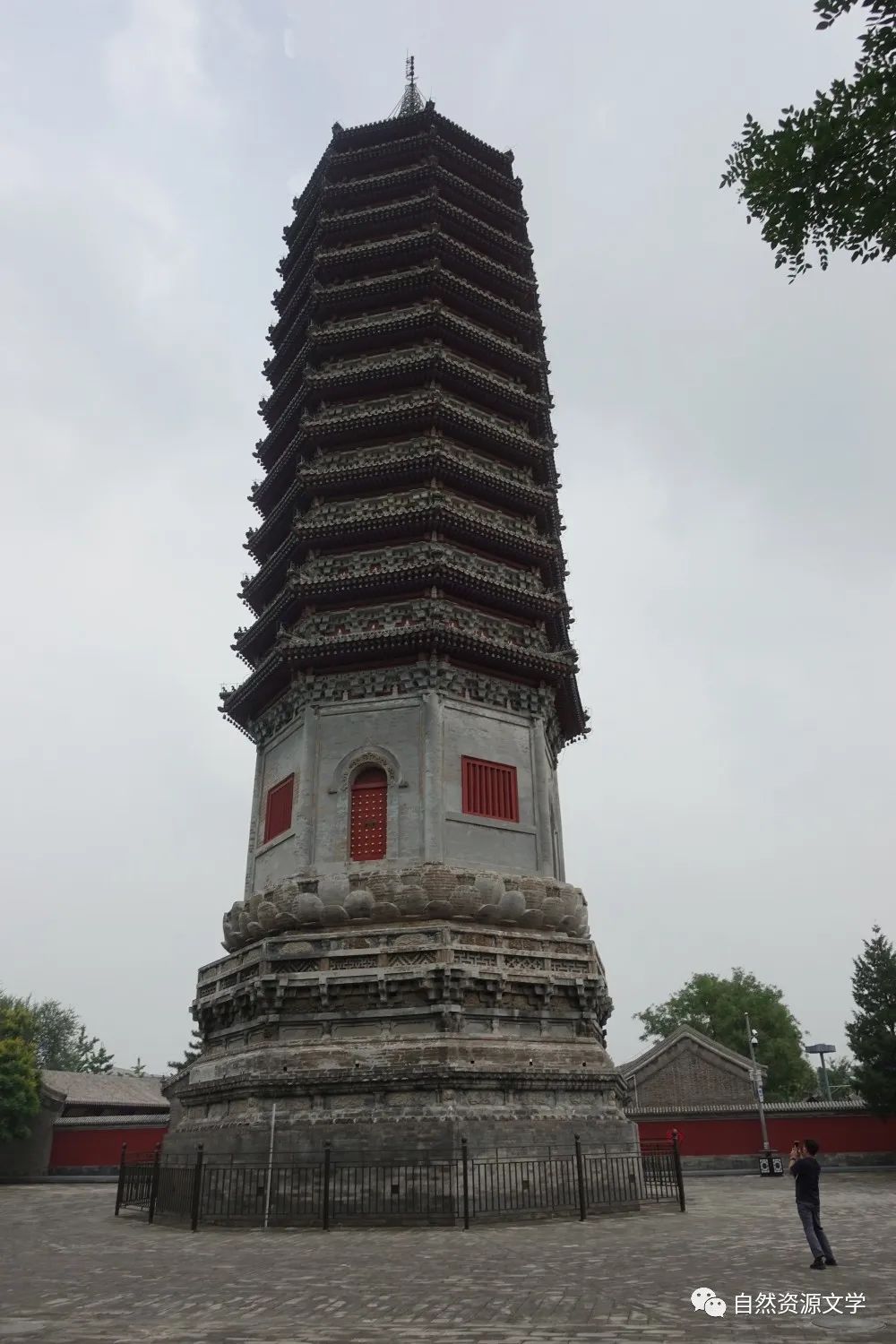 燃灯塔八角形,砖木结构,下部高大的须弥座式基座,束腰雕刻着人物及各种图案花纹,精细生动。第一层塔身高大,东、南、西、北四正面各辟一门,南门深约两米,原内供佛像。其他三面均为假门,又称壸门。塔身另外四面,则辟直棂假窗。塔为实心,便不能像空心的楼阁式塔那样登临远眺了。塔上十三层密檐,檐下砖砌斗拱,木制椽飞。每层檐角及椽飞都悬挂着铜制风铃,共二千二百余枚!神州大地,我游历了多少古塔,尚未见一塔悬挂这多风铃者,堪称全国之最了。清风拂来,铜铃随风摆动,清韵悠远。