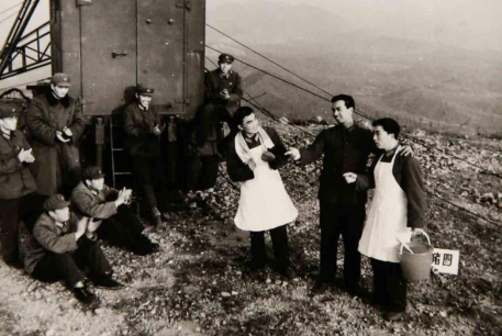 三人演唱组在江苏省江阴县宝华山山顶为导弹部队值班人员演出(李同溪 摄影)