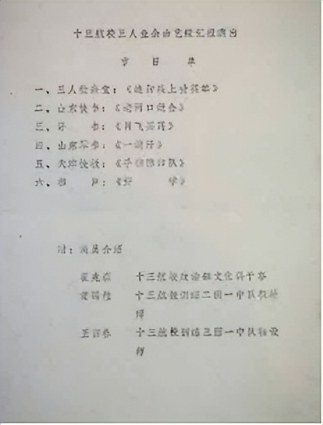 自1970 入伍以来,我参加了每一届宣传队,从新兵干到队长。接到任务后,我认为,无论从队伍组成、演出形式还是节目内容,宣传队都应该有创新。我们首先敲定了演出的主题特点—无论什么节目, 都应该符合时代新形势,切中时代脉搏。在当时的节目单上,有发扬我军英雄主义气概、反映中越边境自卫反击战内容的数来宝《边防线上赞英雄》;有从正面引导正确认识农村经济体制改革,反映农村搞联产承包内容的山东快书《老两口赶会》;还有反映我们自己部队真人真事,我们自编自演的山东琴书《一滴汗》《手榴弹归队》以及讽刺社会不正之风的相声《好学》。