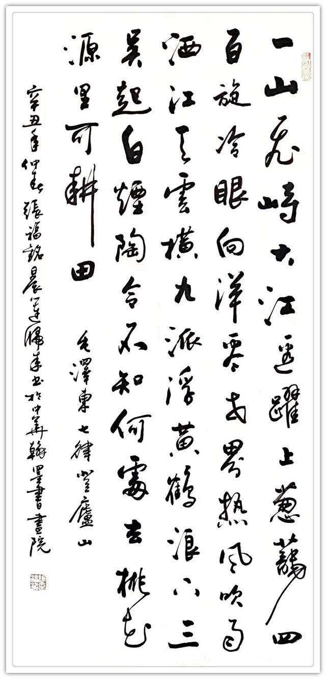 他画画有军队生活给予的气势磅礴,也有文人修养带来的儒雅清芬,写意梅兰竹菊,也可以盈满诗情画意。一作一品,耐于读,神于观,看得人赏心悦目,醉享无限。又有博涉多优,奋笔作书法的精气神。诸书皆成,尤其一笔行草写得瘦硬有精神。磨砺书法,观尽前人笔墨奇迹,见地深刻,可以在起笔落笔之际,把行草作品写得遂心应手,天质自然!