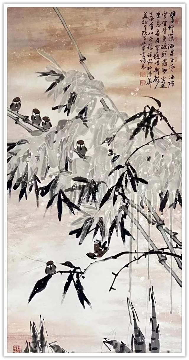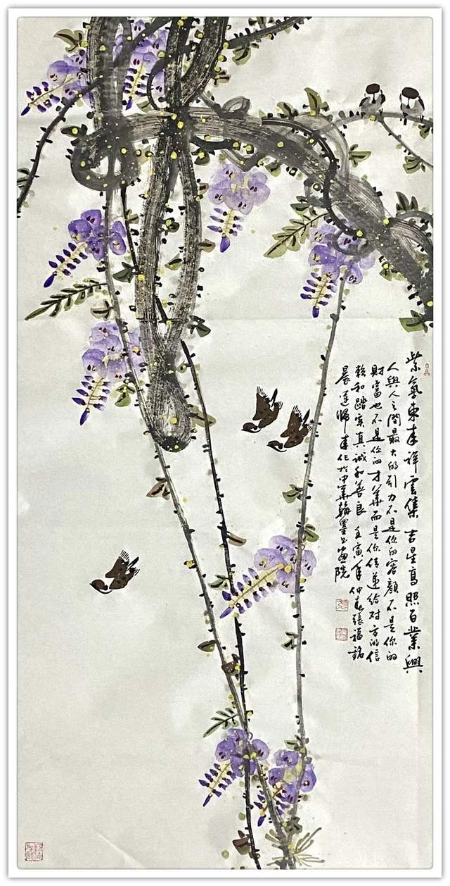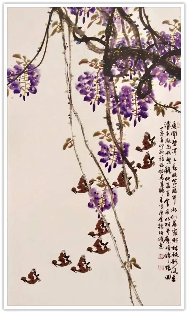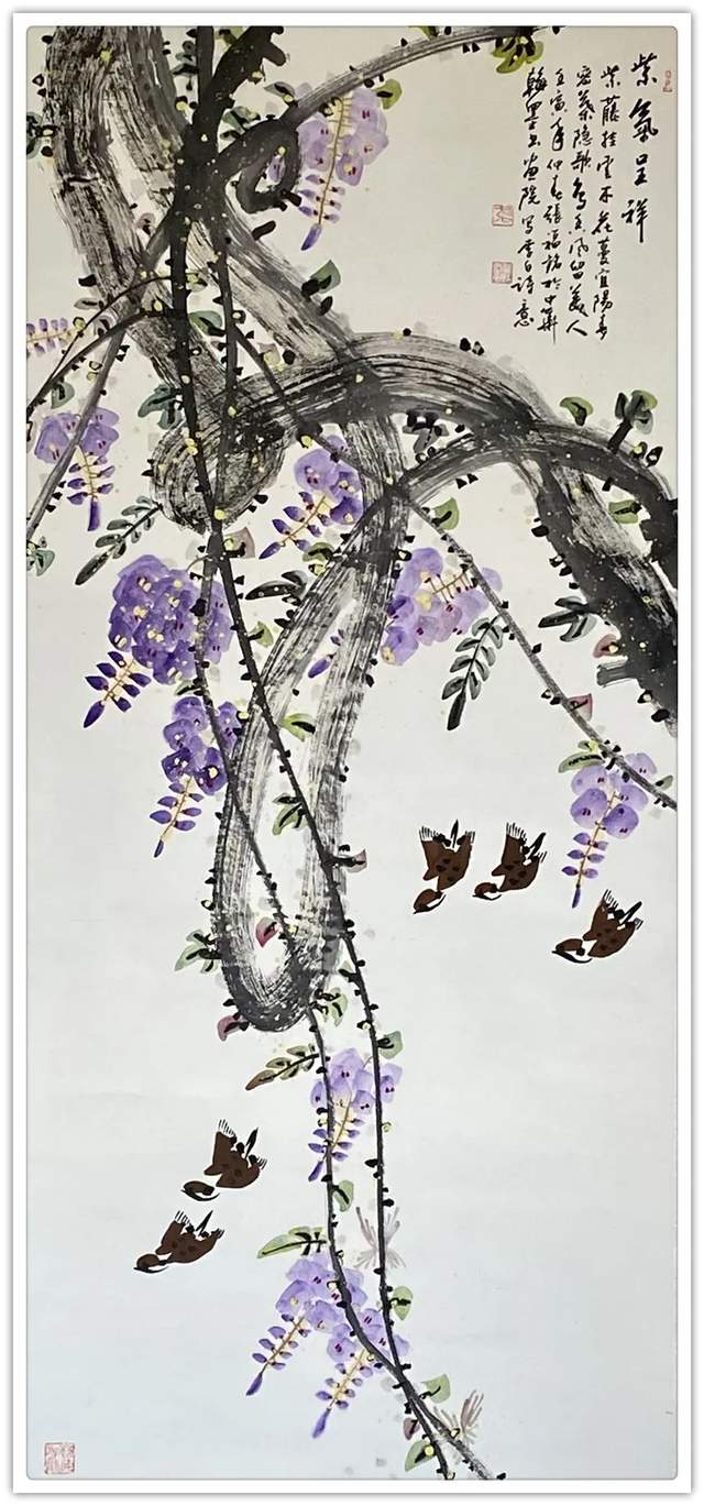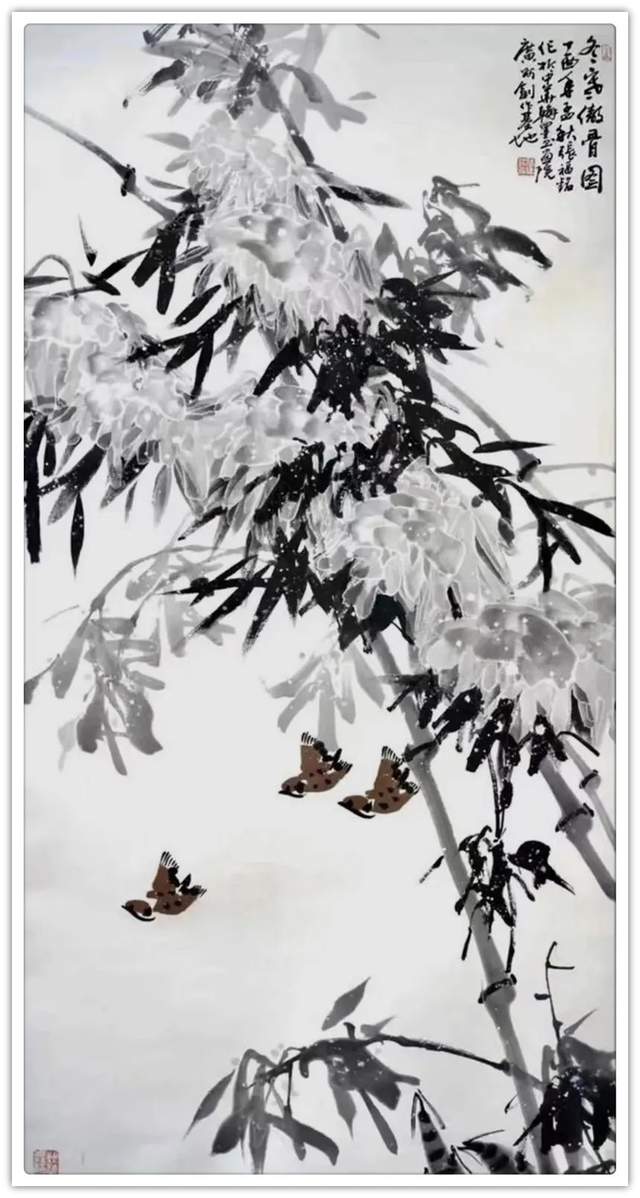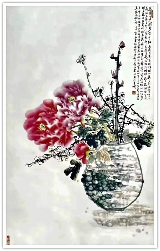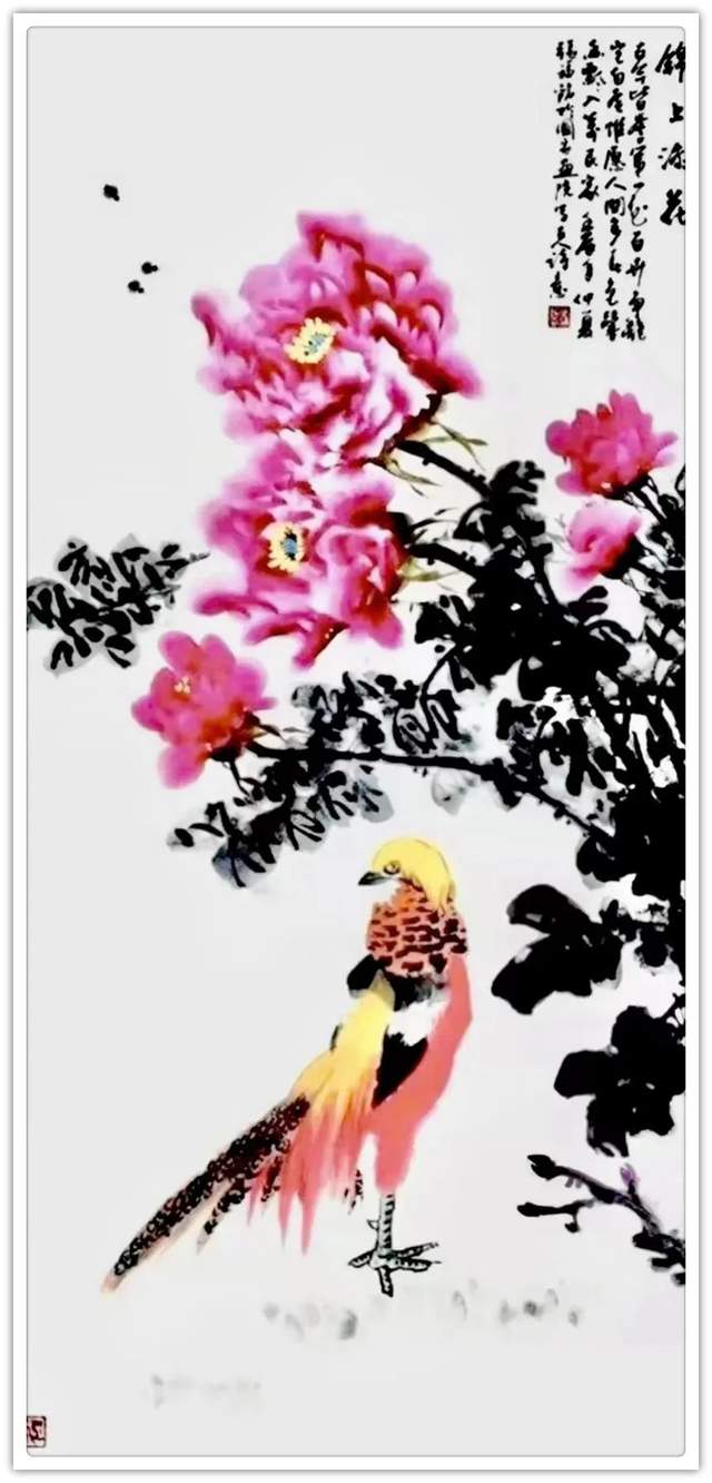 同样,他画其他花鸟作品也是文武兼备的证见!笔墨铿锵写意富贵牡丹,非仅富贵也!最有雄迈品!铁笔塑铁筋,雄墨写雄魂,骨法用笔,应物象形!再经过随类赋彩,就把牡丹画得既有君子之修,也有侠者之勇!他的画法刚则万分刚猛,雄则百倍雄强,给观赏者塑造起一个可以感受震撼力的艺术空间。在这个空间里游目骋怀,必然会心感铮铮!浓墨重彩,浑厚华滋,无限的审美张力,令他成为画坛的铁流派。唯有在军中得到身心熔锻,方得笔墨如此峥嵘!