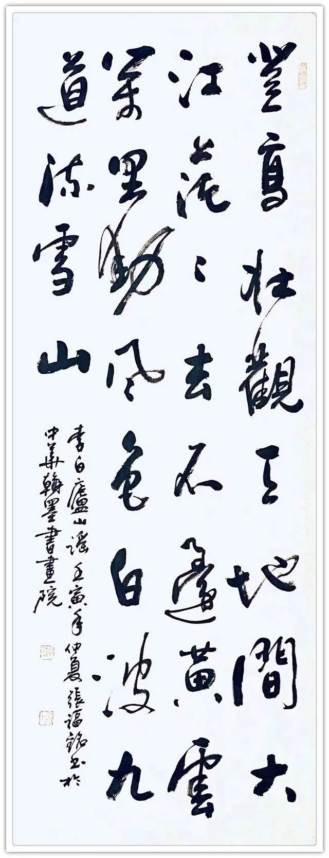 文武兼备,书画双修。作為歐陽中石大師的弟子,張先生书法线条造型的意识相当强烈,一笔拉过来,如临危居高,作高低有趣。一笔纵过去,如虬龙蜿蜒,写牵丝映带。笔与手合,手向心师,经过激楚浪以成文的表达,写出了小草千字文的铁点银钩,亦可以把兰亭序的千变万化表达得出神入化。技达精时谓之巧,艺到峰时名为妙。先生之书法亦如丹青创作,巧妙兼生,功在三山巅,佳谈八方誉!