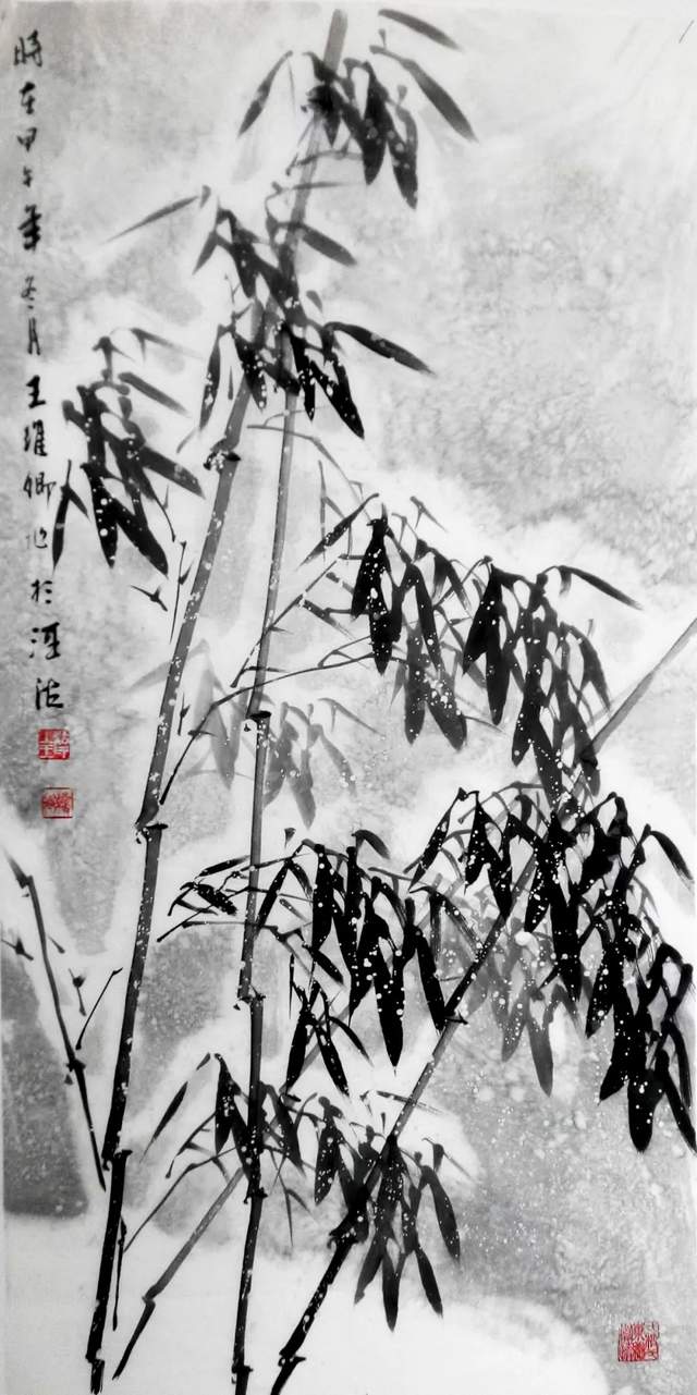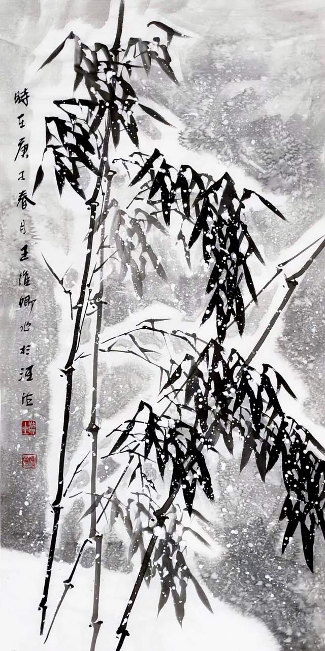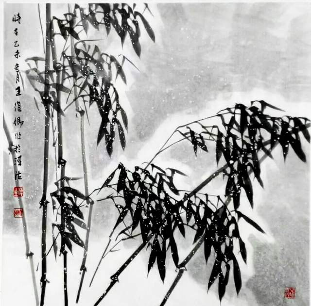 画红竹者古之有之,多为取朱砂研磨为膏,以水调制而画之,意为吉祥辟邪之意。先生之红竹亦有趋吉辟邪、鸿运当头之意,故为世人所喜爱。忽如一夜瑞雪将,千杆秀木扮银装。瑞雪压枝枝头低,瑞雪与翠竹呈现出碧玉相间之状。先生之雪竹与风雪中傲立,于恶劣气候下挺劲,不屈不挠,风雪覆压,难掩坚韧。观之,画作以画喻事喻人,给人以坚韧不屈之势,坚定向上之鼓励。