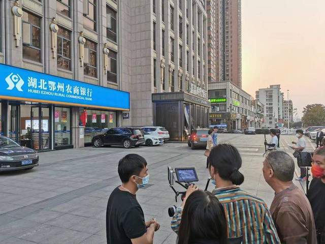 傍晚,回到城里拍摄农行贷款买鱼苗这场戏。余书记和小武贷款后从银行出来。
