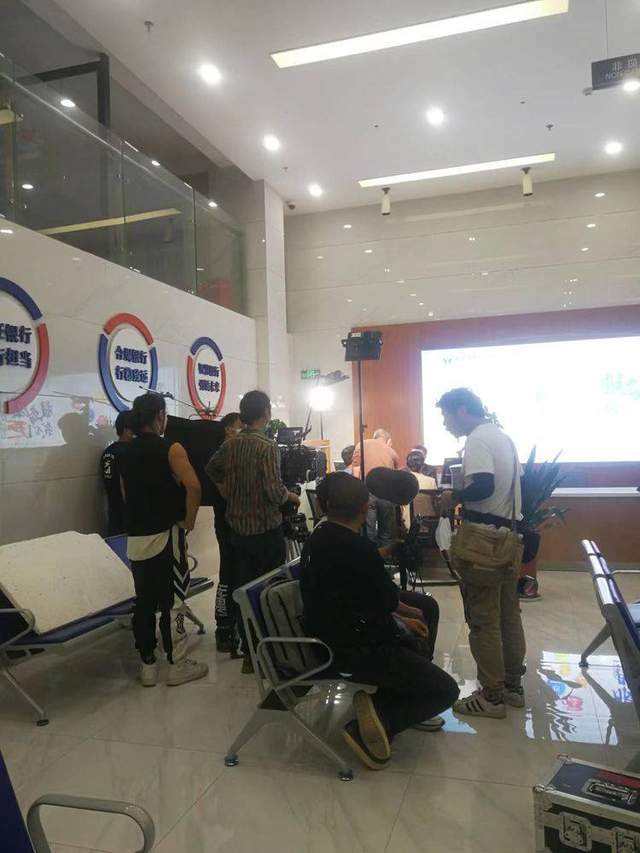 夜幕降临,拍室内的戏,银行工作人员也是银行职工出演。虽然是夜晚,灯光很给力,如同白昼。