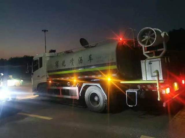 夜色中,洒水车喷出的瓢盆大雨,很逼真。