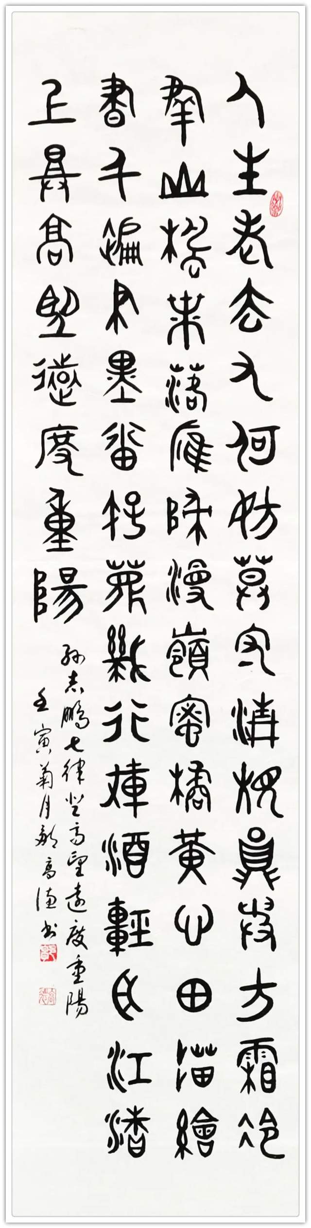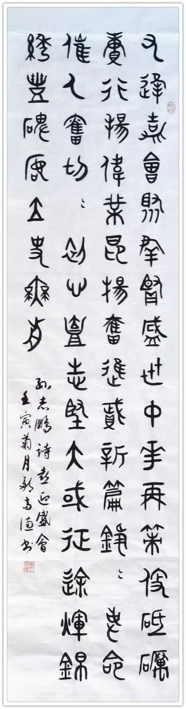 篆隶之功,非古意盎然者不可作之!而今日的邹高德先生显然就是这样一位富有古风意韵的传统性书家,而其众幅篆隶之作也自当是可彰以正雅法脉!尤其是在隶书的创作上,邹高德先生是深知取法的路径,碑之所得可蕴奇绝,无论是笔法的稳重,还是墨法的沉着,亦或是整体隶书的结体格局,在邹高德先生的笔下其均是有致于一种不激不厉的创作表现,取法也不再是简单的复刻描绘,而是在时代翰墨的基础上继升出自我的笔墨感受!下笔不求急躁,而是任以恳切,没有大起大落,章法不尚矫揉,而是唯见端雅,正是简约厚朴,如此高迈隶书,完全是可堪称为当下最佳呈现也!古意所驱,浩然正气!