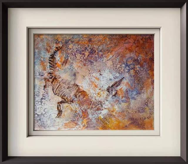 背景与物象不作特别鲜明的层次区分,而是写意成砂砾岩画的紧凑空间,用扁平式的构图方式,让画面呈现出活化石的观感,画出岩画斑驳朴茂的远古印象,具有非常强烈的审美张力,也有独特的文化装饰价值。如若收藏,则会因不可复制而有不可估量的价值潜力!