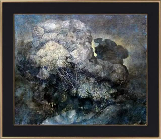 他是海百合的知音,把这种生物的生态进化视为人文内涵的寓言。知之为深,画之为神,把这一独特的物象酝酿成人文画题的独特。一叶一花总关情,流丽朴茂寓哲思,用岩彩画海百合,突出了色彩的质感和动感,极致地渲染出光影下物象的神秘感,光感奇幻,统摄心灵。