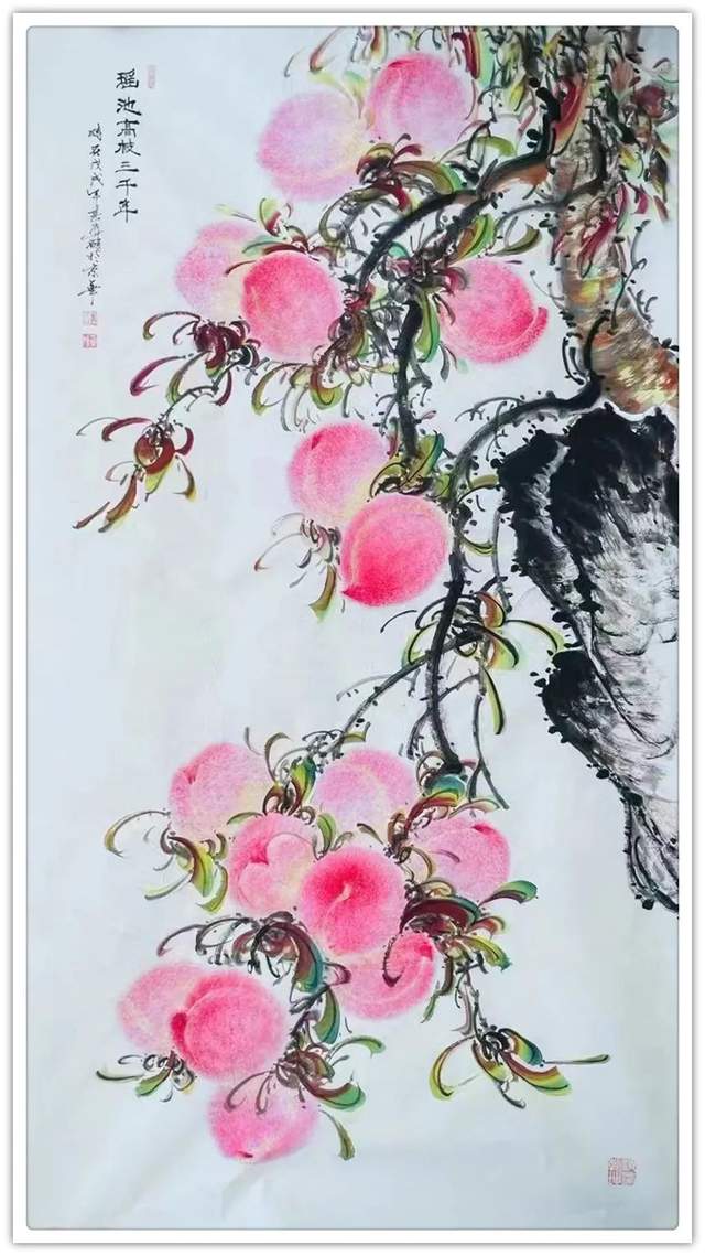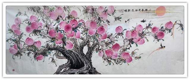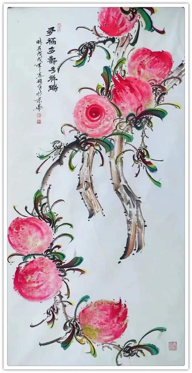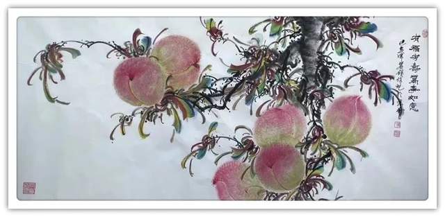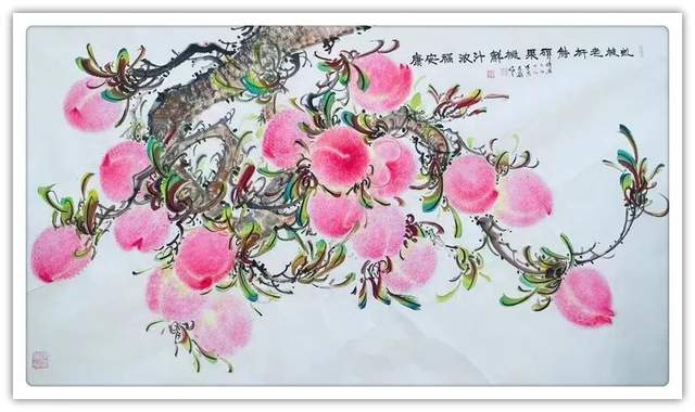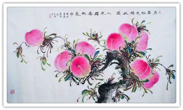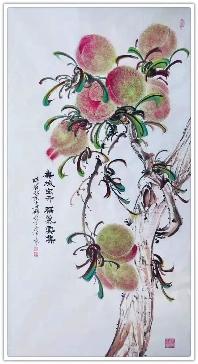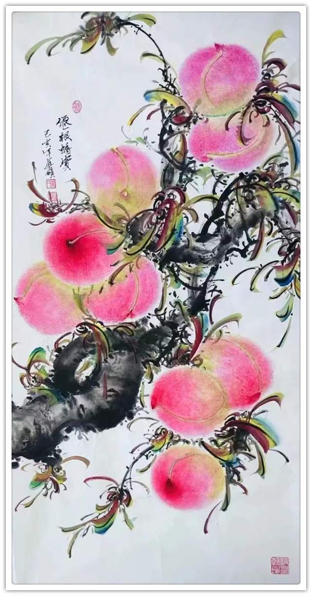 由此可见,崔真硕先生之画桃,艺术包涵万类诸事,把桃文化寓意铺陈到了致广大的境界!完打破寿桃一题的范式拘泥,从“依规制作”的形态,转向了“非凡创作”新形态,让他画出来的桃子作品拥有无限可观的艺术个性,避免了同质化的流弊。以笔墨当随时代的担当为主导,以服务人们群众生活审美之需为要义,坚决屏弃范式制作寿桃的习气,开创了崔氏寿桃的新篇章,让崔门笔墨带着与众不同的新风采,成为人人乐享愉受的画道神品。这是主题宗旨新的美学丰碑。