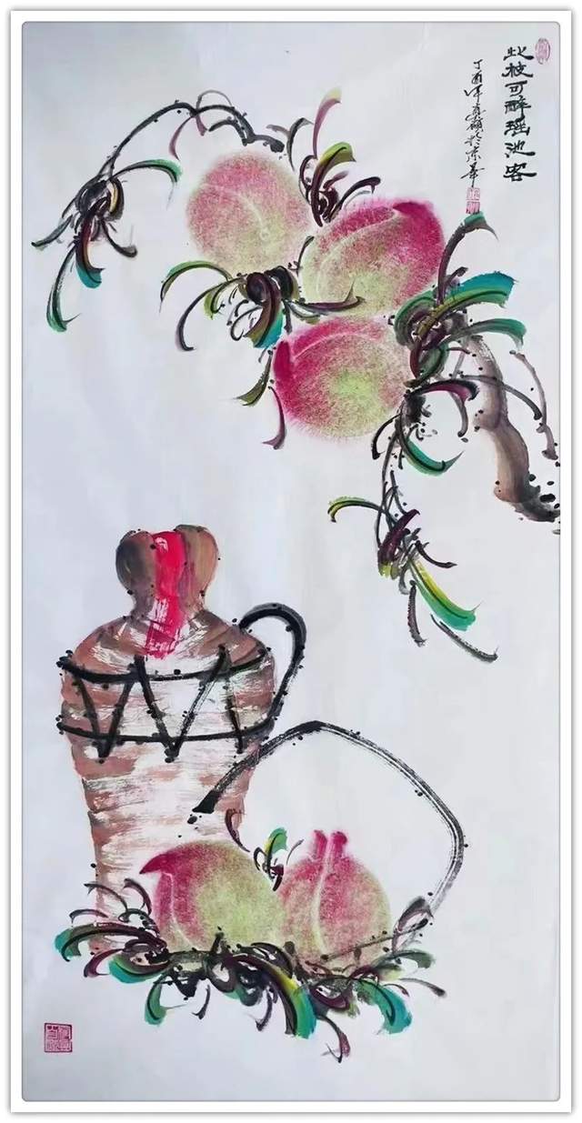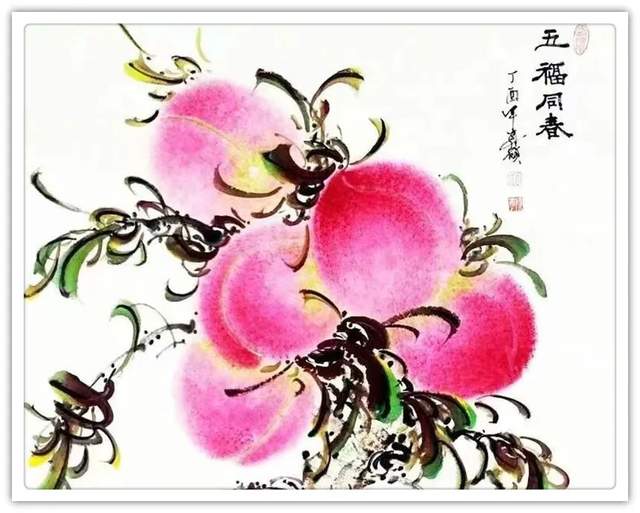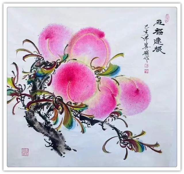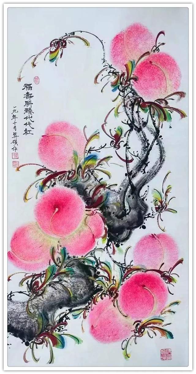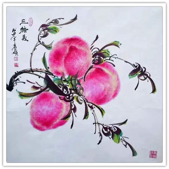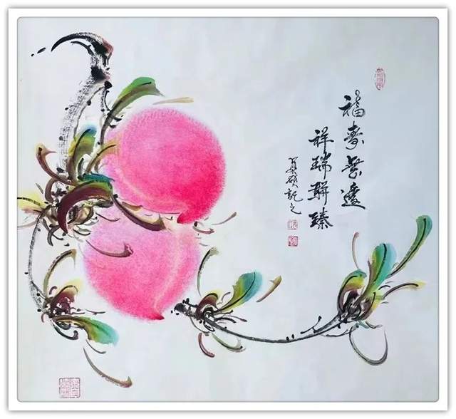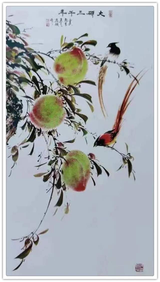 由此可见,崔真硕先生之画桃,艺术包涵万类诸事,把桃文化寓意铺陈到了致广大的境界!完打破寿桃一题的范式拘泥,从“依规制作”的形态,转向了“非凡创作”新形态,让他画出来的桃子作品拥有无限可观的艺术个性,避免了同质化的流弊。以笔墨当随时代的担当为主导,以服务人们群众生活审美之需为要义,坚决屏弃范式制作寿桃的习气,开创了崔氏寿桃的新篇章,让崔门笔墨带着与众不同的新风采,成为人人乐享愉受的画道神品。这是主题宗旨新的美学丰碑。