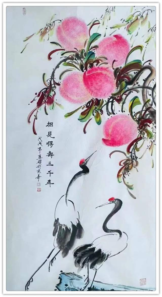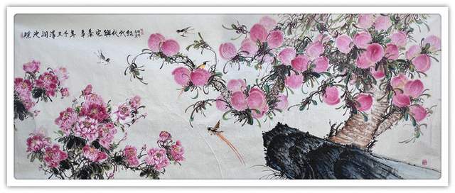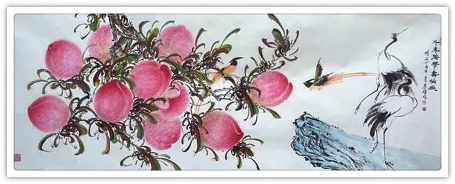 以桃寓意强大的生命力和精神活力,是一个当代理想而热淳文化专题。它有很深的文化内涵,也有相当博大的受众群体。试想家有寿翁享天伦,要是有一件和和美美的寿桃作品呈现于眼前,挂饰于大堂,那真是锦上添花的时光醉美!除了以桃寓寿,崔真硕先生还有极致开拓桃文化寓意的新思想、新实践。在崔真硕先生的丹青体系里,他认为寿桃过去只是一面的代表长寿,唯祝寿而用限制了这一专题折外延拓展。他敢于创新,勇于实践把寿仙桃的寓意扩大到符合时代蒸蒸日上的文化创新洪流中,为桃画凝聚了“建功立业”的新寓义,把人们希望万岁事业万岁的美好期望,用结实千秋的画境表现得完美无缺。又给新郎新娘送上两个大仙桃题款“相拥百年”,让婚庆文化带来新的祝福方式。新人婚后生了大娃娃,送个大桃子画,题款“结实大硕”竟然是人丁兴旺的独特吉意。企业庆祝画大仙桃,题款“宏业博兴结实千秋”这又是企业文化的新形态……
