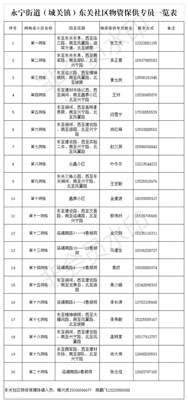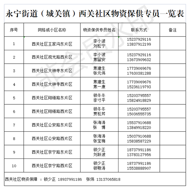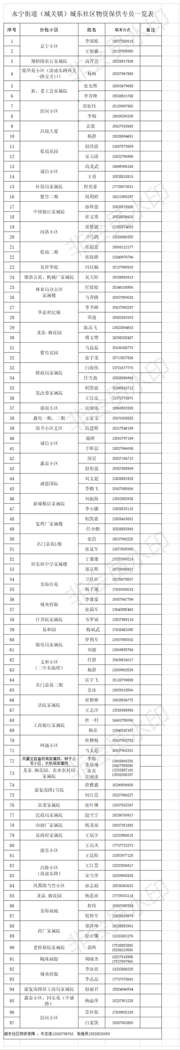 永宁街道(城关镇)各社区物资保供专员及联系方式如下: