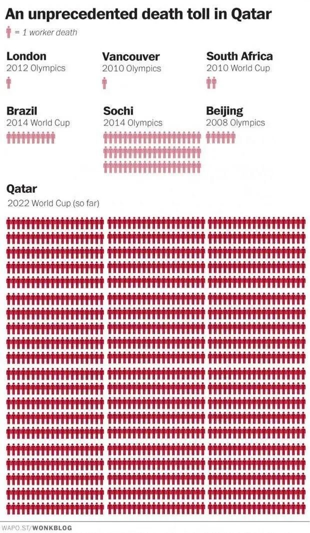 数字“8”,代表着此次世界杯将由8个比赛场地组成,同时也是无限符号“∞”上面还有西亚纹理特色的阿拉伯和亚洲文化的元素图案。吉祥物直接用卡塔尔的传统服饰“长袍”做了拟人化处理卡塔尔斥巨资打造豪华大熊猫馆,馆内功能齐全,有带空调的运动场、室内展厅和豪华单人房。在卡塔尔工作,没有雇主允许你是没法离境的,有护照也没用。司机(主要来自印度和非洲)收入500美元/月;建筑工人(主要来自尼泊尔)100-200美元/月;硕士底薪差不多4000多美元/月去之前以为是土豪国家,去了之后发现除了市中心,其他地方就是国内城乡结合部的感觉,不少地方还没有路,所以卡塔尔本地人都开越野车。《卫报》刊文:自开始体育馆建设到2021年初,造成了6500名外籍劳工死亡。