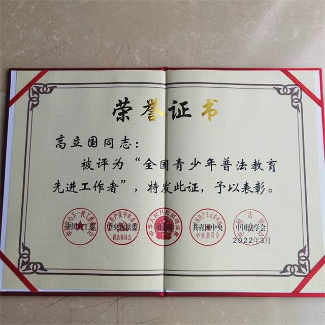 2022年6月,中国关工委、中央政法委、司法部、共青团中央、中国法学会联合印发《关于表彰全国青少年普法教育先进集体、先进工作者和优秀辅导员的决定》(中关工委〔2022〕7号),鄂州市教育局关心下一代工作委员会被评为全国青少年普法教育先进集体,葛店开发区关工委常务副主任高立国被评为全国青少年普法教育先进工作者。