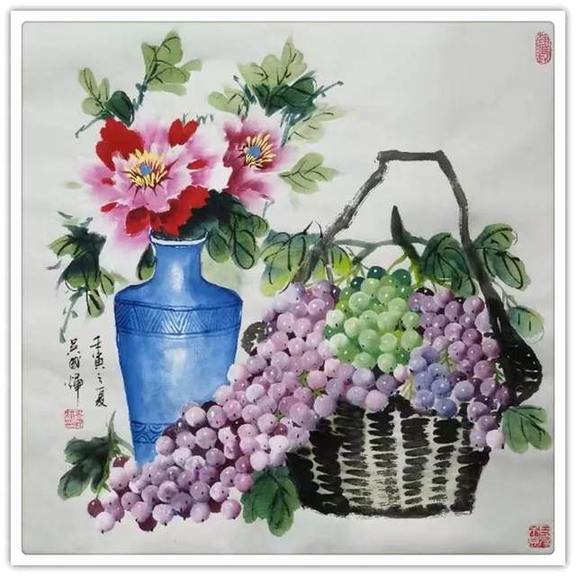 和生动的写生妙象和自然意趣,可以说是吴国辉先生今日树立丹青画品的另一基础所在。并且和牡丹的雍容大气不同,这种独属于写生妙象的自然意趣,则是有更多体现在了他的一些紫葡画作和小品花卉作品上。就以其一幅牵牛花画作来说,画中鸟雀结伴而飞,好似嬉戏一般振翅盈动,再搭配一串渐变紫嫣的牵牛花朵,整幅画面即更是可见于一股妙趣横生的怡情滋味!两者一动一静,是谓相得映彰,画风简洁洗练,亦是妙造自然!畅情之感,可谓浓郁!