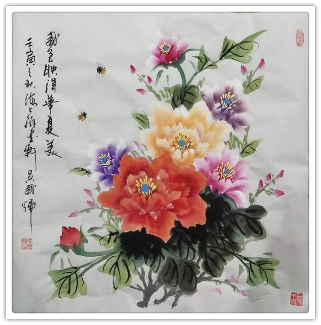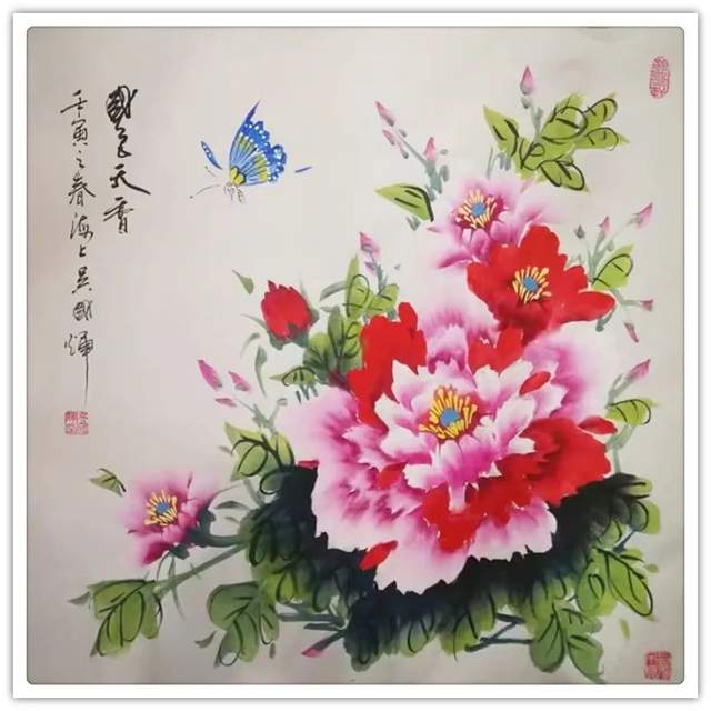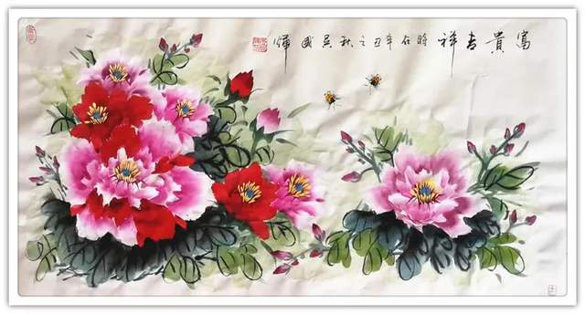 牡丹作为中国传统丹青艺术中的一大重要创作题材,它所蕴藉和包含的艺术价值和审美价值显然都是不可估量的,而这也是为什么牡丹题材画作能够传承至今而不衰的一个重要原因。今吴国辉先生执笔而绘丹青,其作品自然也同样是有以牡丹题材最为出众!众幅画中牡丹,用笔是有遒健之妙动,笔力所道之处,尽是有行遒劲于婉媚,而在赋色上,吴国辉先生亦是有着十分深厚的色彩表现把握,旨在能于牡丹千姿百态的风貌上赋予其最为典雅的审美格调,薄粉淡施之际,仿若春意嫣然,浓墨重彩之际,更是娇艳如阳,前者是谓媚而不俗,后者是谓艳而不庸,如此诗情画意的富贵之感,由此尽是可以供观赏者了然于胸!